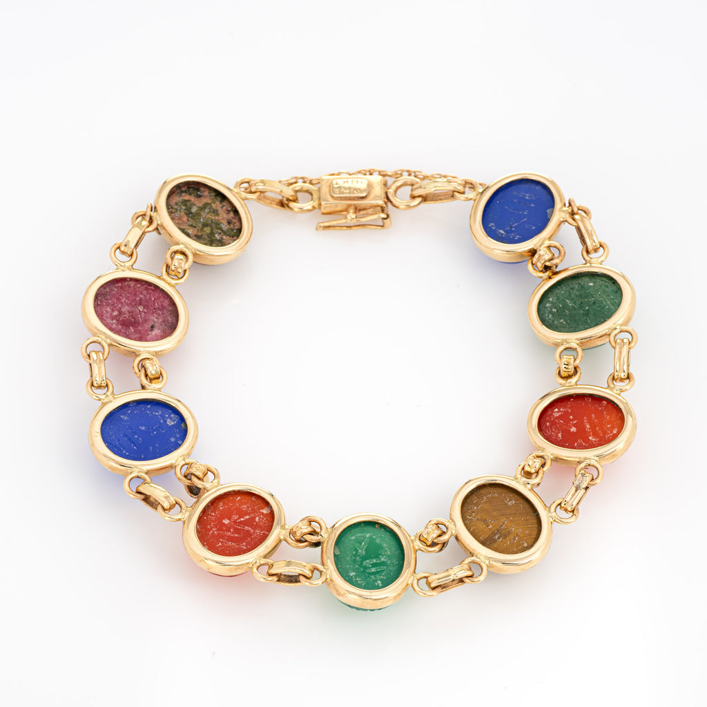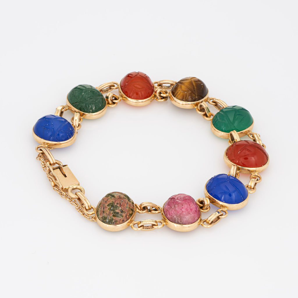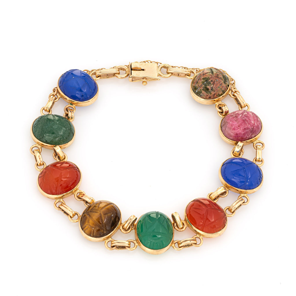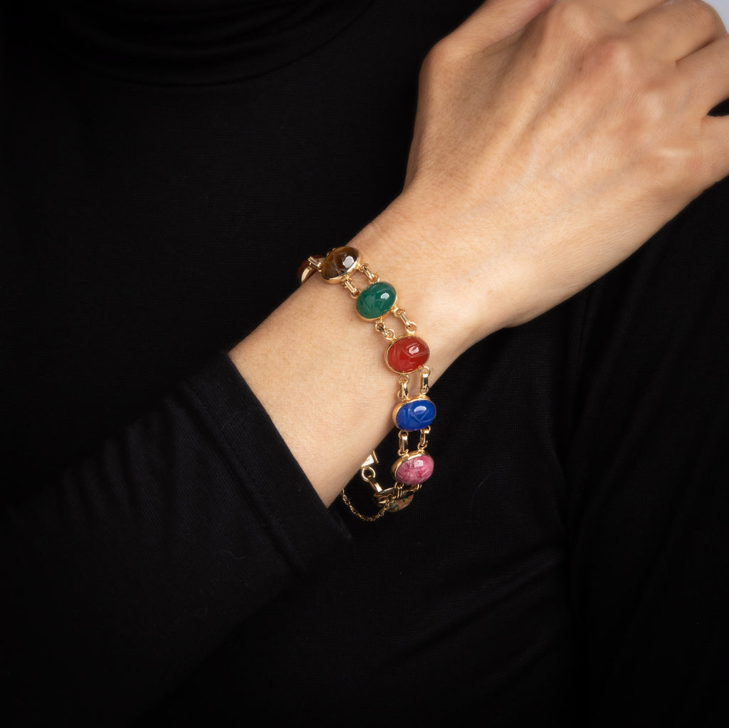 The bracelet makes a great statement on the wrist. The colorful stones are each etched in the form of a scarab. The scarab is a symbol of protection and transformation. The bracelet features a slip lock closure and safety chain. Ideal worn alone or layered with your fine jewelry from any era.