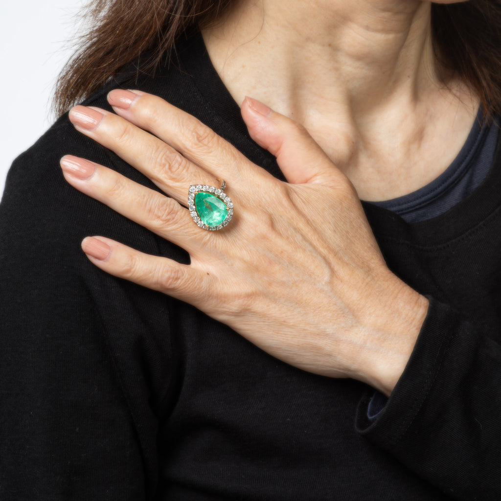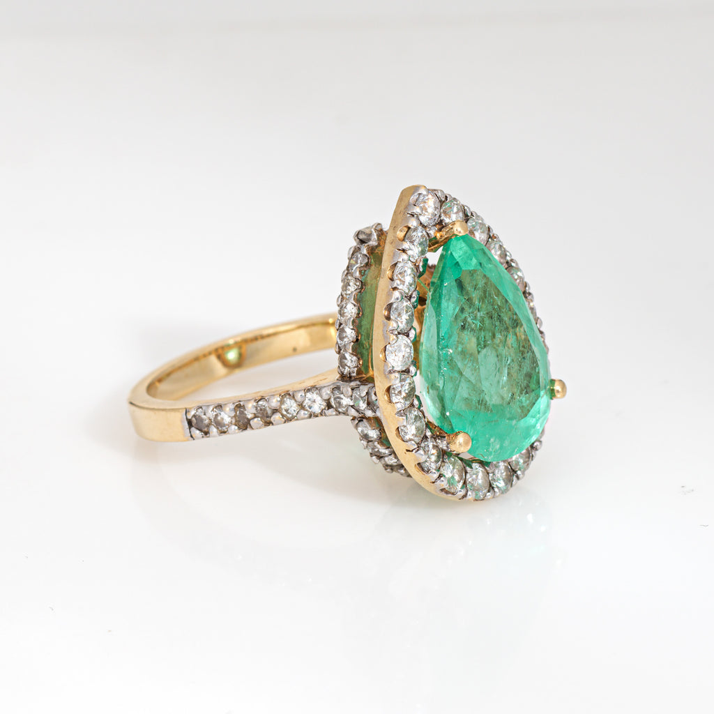 The large vibrant pear cut emerald is surrounded with a halo of sparkling diamonds. The statement ring adds a nice pop of color on the hand. The high-rise ring (13mm - 0.51 inches) sits comfortably on the finger.