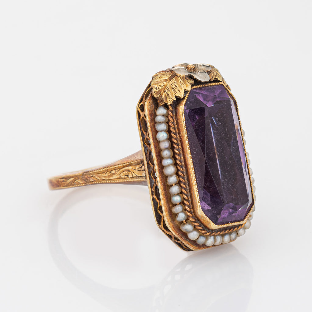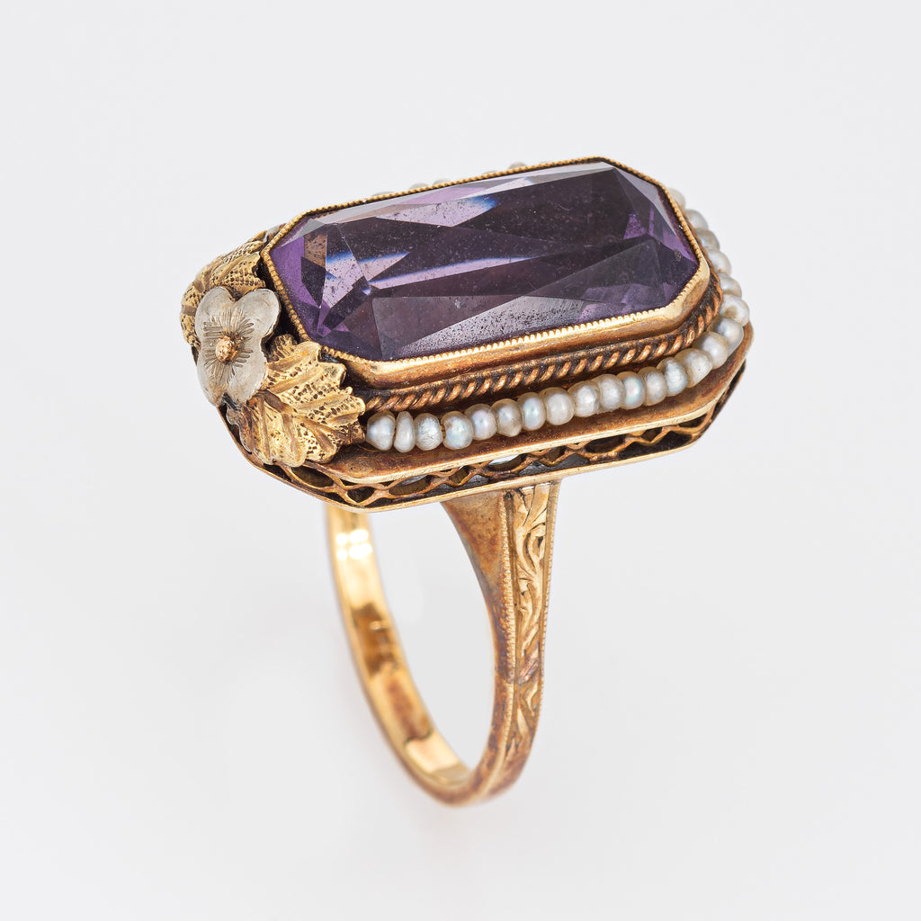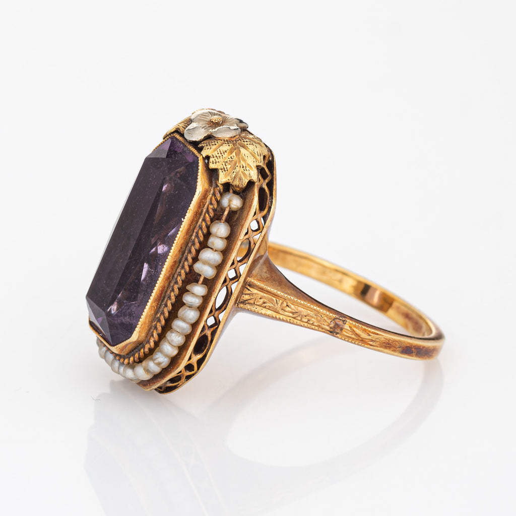 Finely detailed vintage Art Deco amethyst & seed pearl ring (circa 1920s to 1930s) crafted in 14k yellow gold.