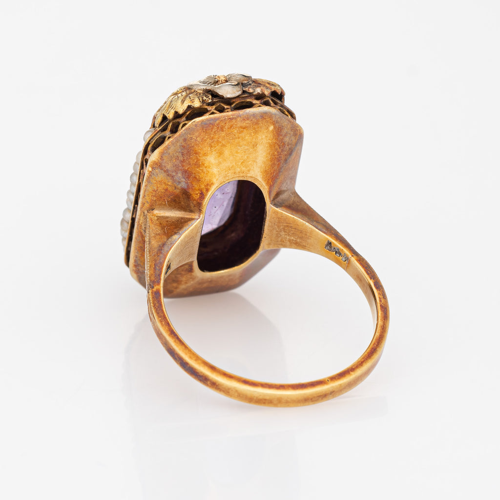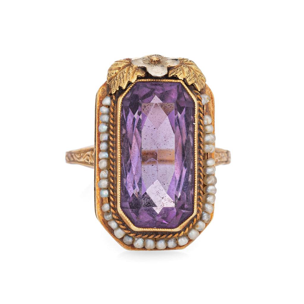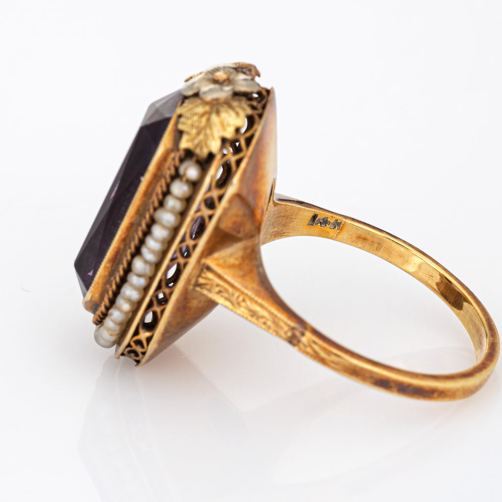 Finely detailed vintage Art Deco amethyst & seed pearl ring (circa 1920s to 1930s) crafted in 14k yellow gold.