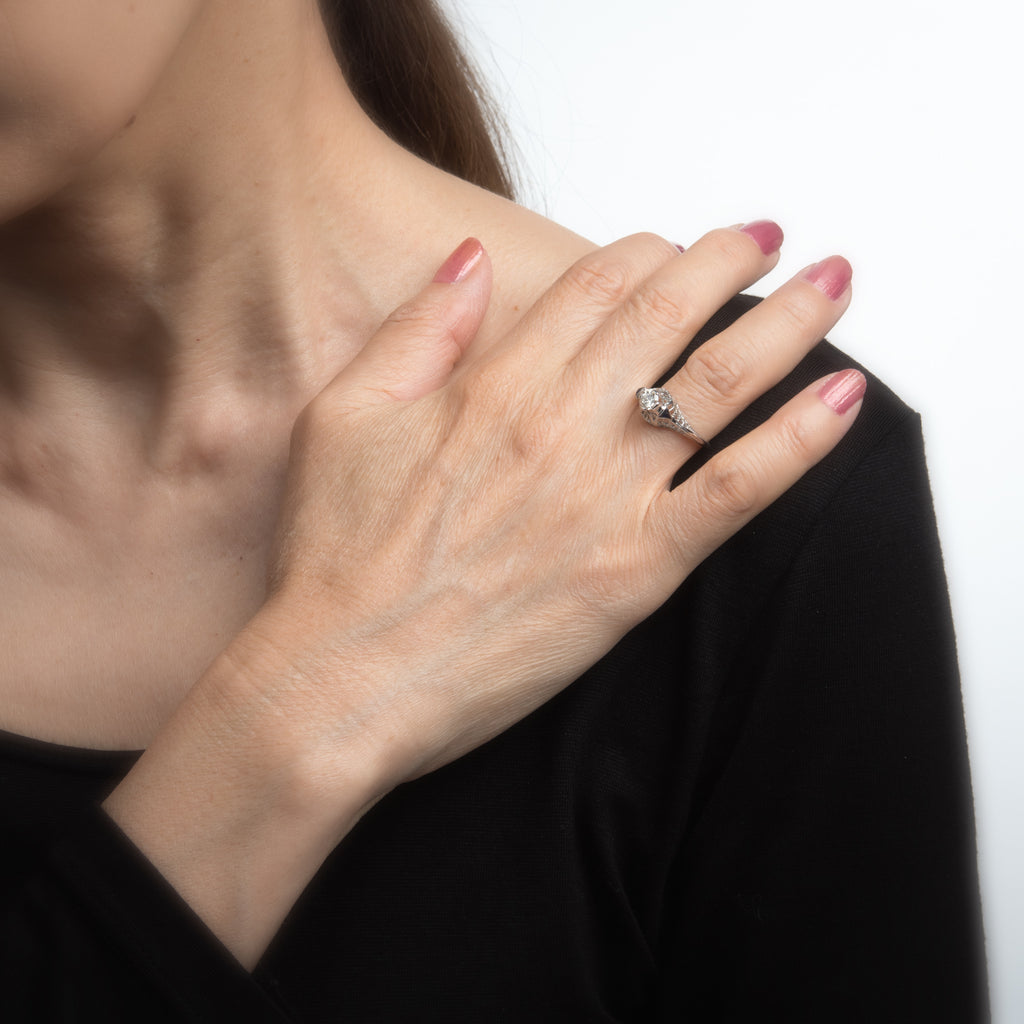 The stylish Art Deco era ring features a sparkling old European cut diamond to the center, with small French cut lab sapphires to the side shoulders in a raised filigree mount. The ring would make a lovely vintage alternative engagement or right hand ring for everyday wear. The ring has a lower domed profile and rises 6.5mm from the finger (0.25 inches).