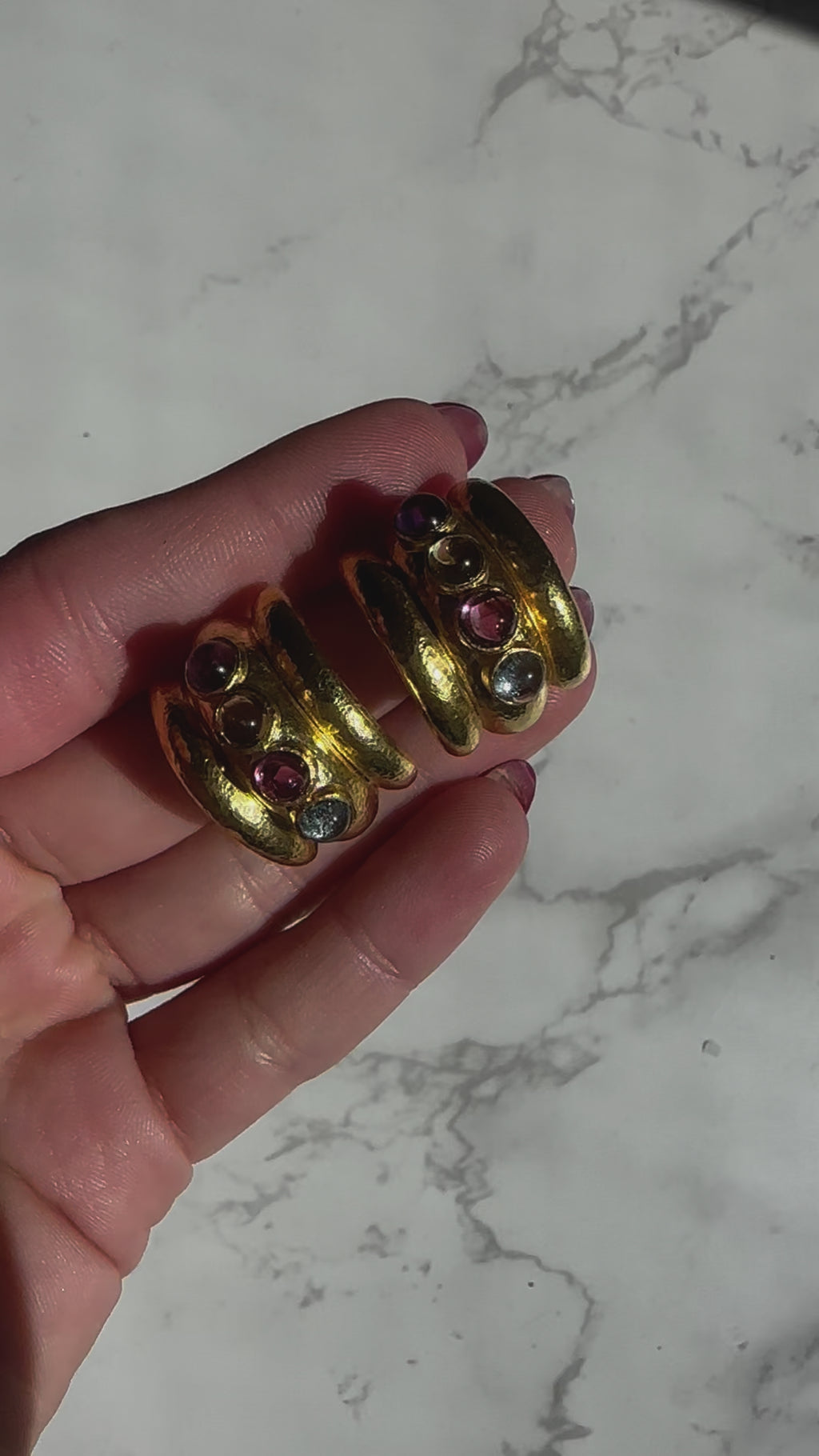 The beautiful hand hammered earrings are crafted in bright buttery 18k yellow gold. Set with a colorful array of gemstones the earrings are super chic and ready to make a summer statement! A vibrant combination of gemstones great for wear during the day or for a glam evening look. The earrings are fitted with collapsible posts for pierced ears and omega backings for wear as clips.