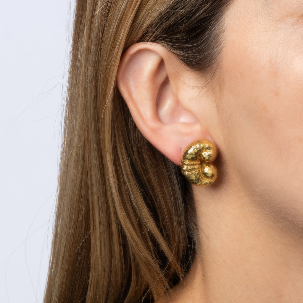 The beautiful earrings highlight a scrolled design with hand hammered details. The bright and buttery 18k gold earrings catch light and shimmer with a subtle glow. A chic pair of earrings to wear during the day and can easily transition to a glam evening look. Weighing 22.7 grams the earrings have a solid and hefty feel to the touch.
