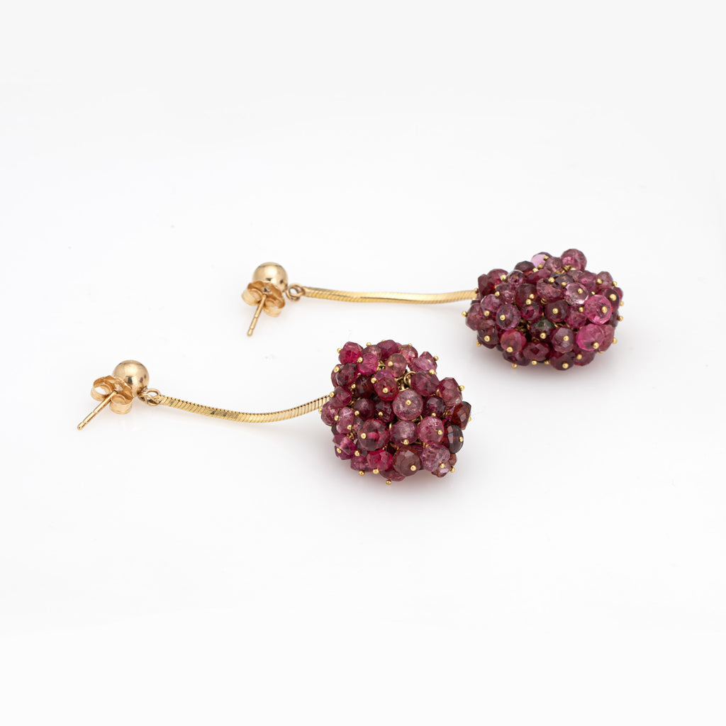 Stylish pink tourmaline cluster earrings crafted in 14k yellow gold (circa 1980s).