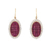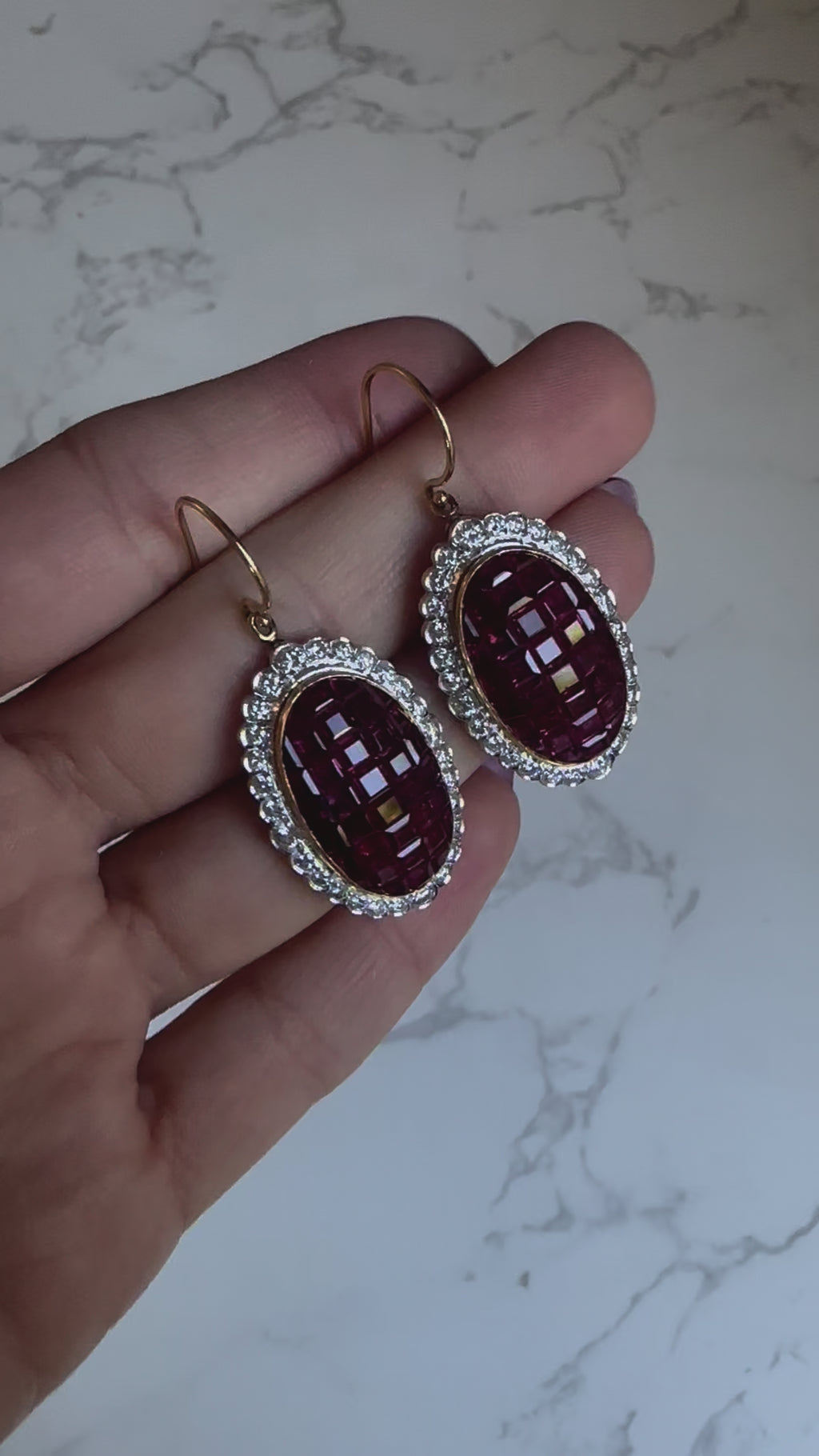 The beautiful rich red rubies shimmer and make a dramatic and memorable statement on the earlobe! Measuring 1 1/2 inches in length the pendant drops move with you. Shimmering diamonds frame the dome set calibre cut rubies. Wearable day or night, the earrings are fitted with hook backings for pierced ears.