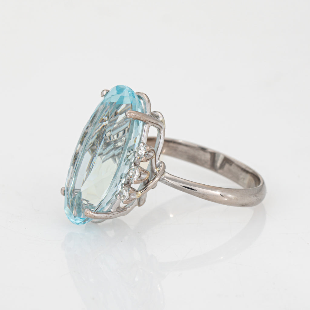 Stones: Faceted oval cut aquamarine measures 17.5mm x 9mm (estimated at 5.91 carats). Six single cut diamonds total an estimated 0.06 carats (estimated at H-I color and VS2-SI2 clarity). Note: few small chips to the aquamarine (visible under a 10x loupe).