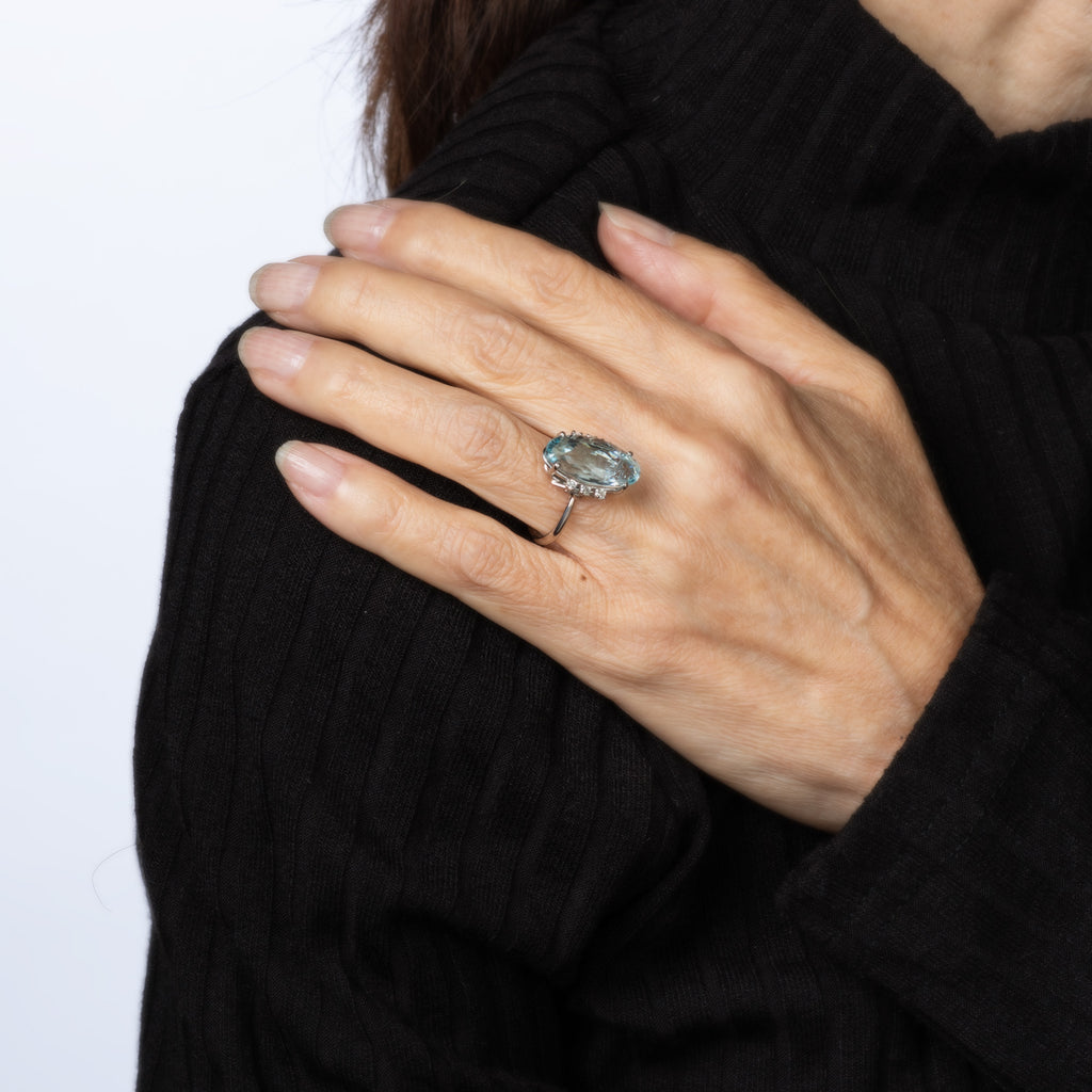 The clear as sky blue aquamarine makes an elegant statement on the hand and shimmers with your every movement. The unique elongated oval design is unlike the more traditional emerald cut. The ring has a medium profile (8.5mm - 0.33 inches) and sits comfortably on the finger.