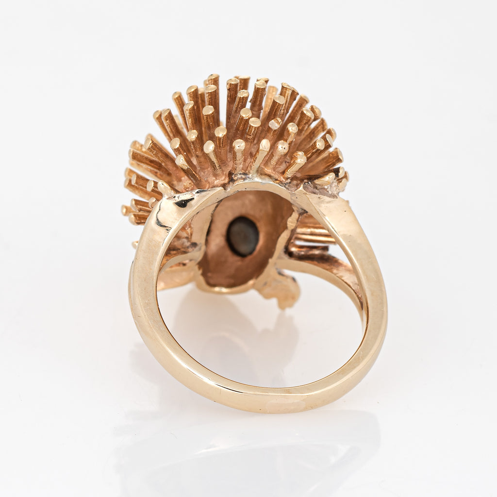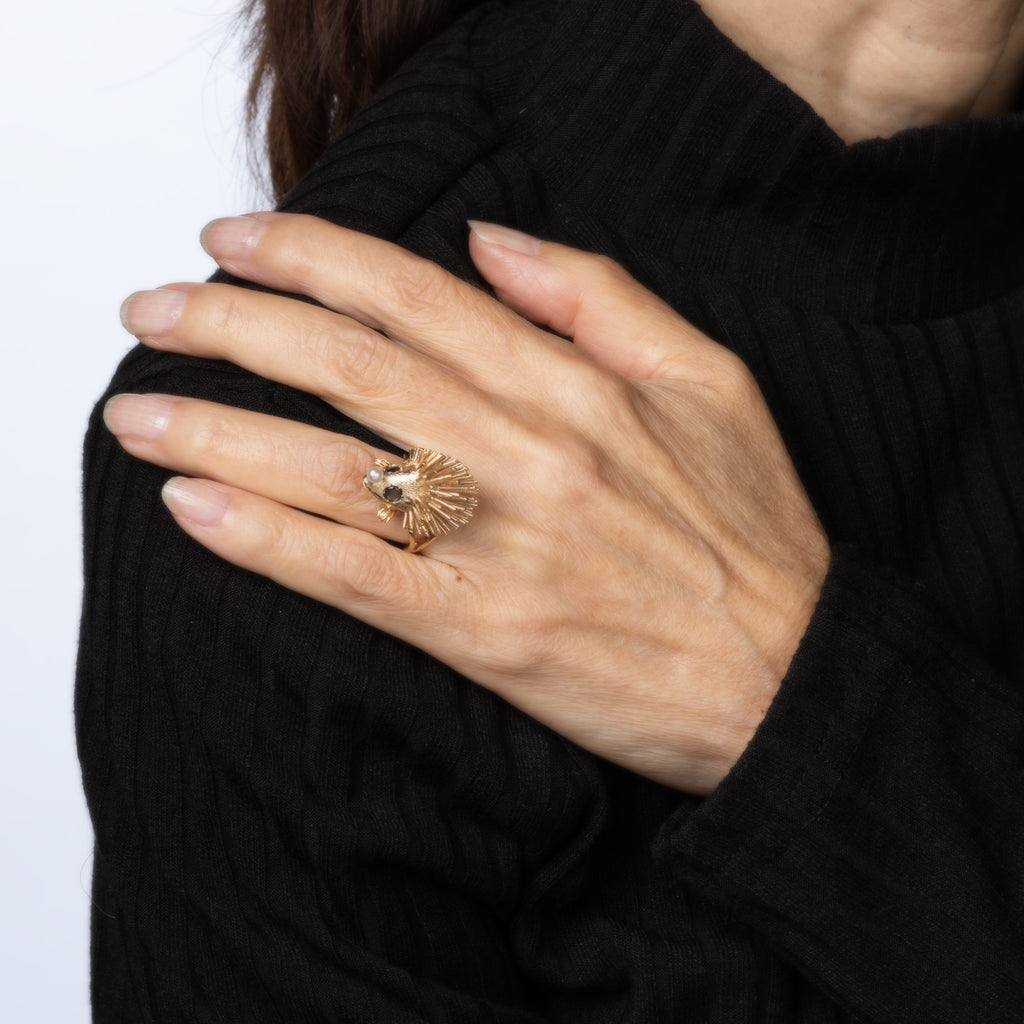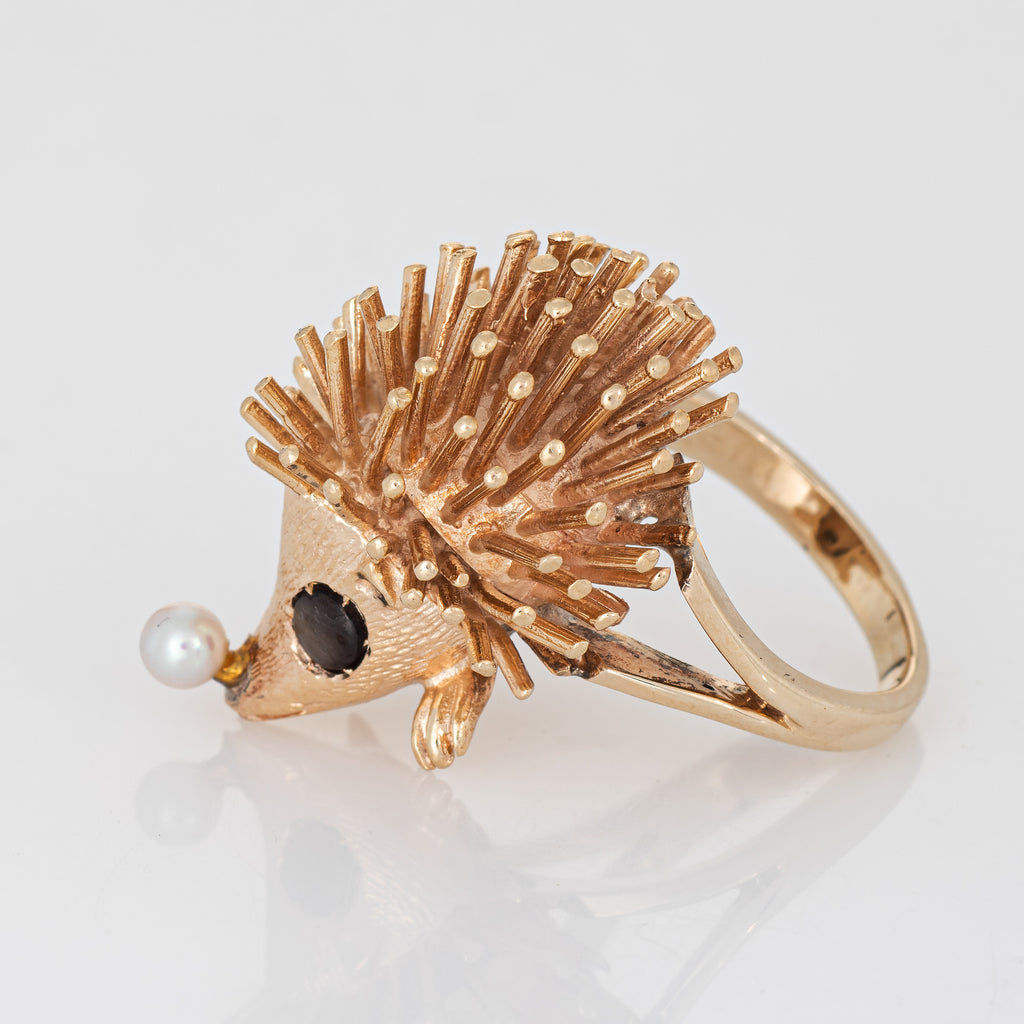 Finely detailed vintage Hedgehog ring crafted in 14k yellow gold (circa 1970s).