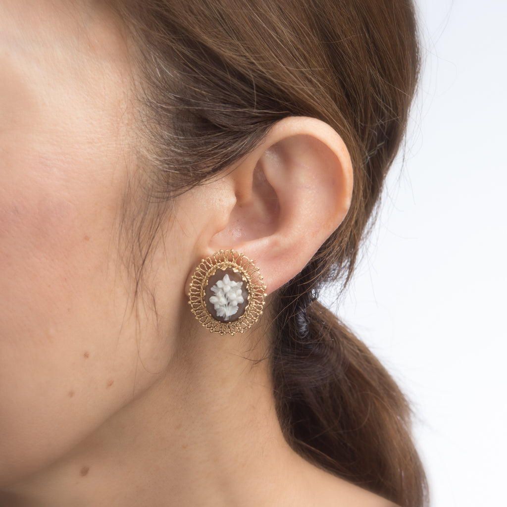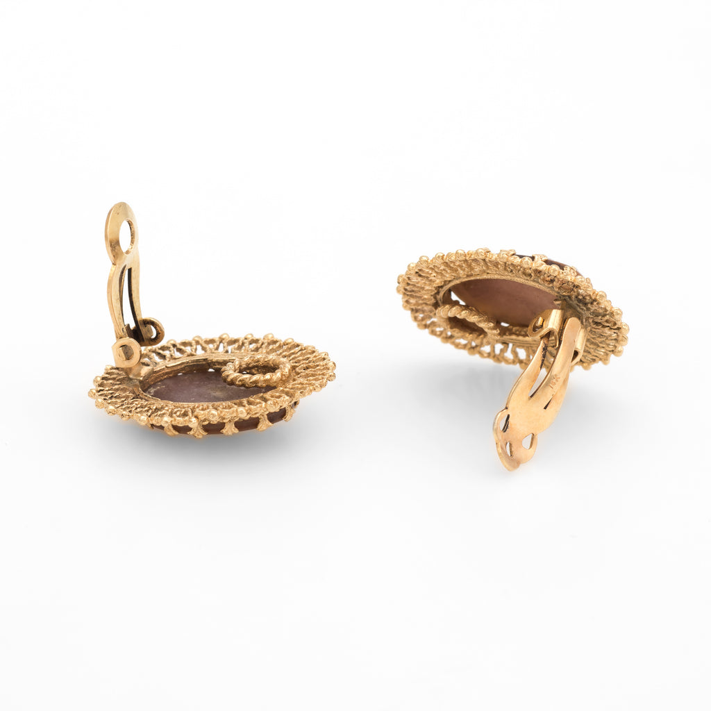 Bouquet of Flowers Cameo Clip Earrings Vintage 14k Yellow Gold Estate Jewelry