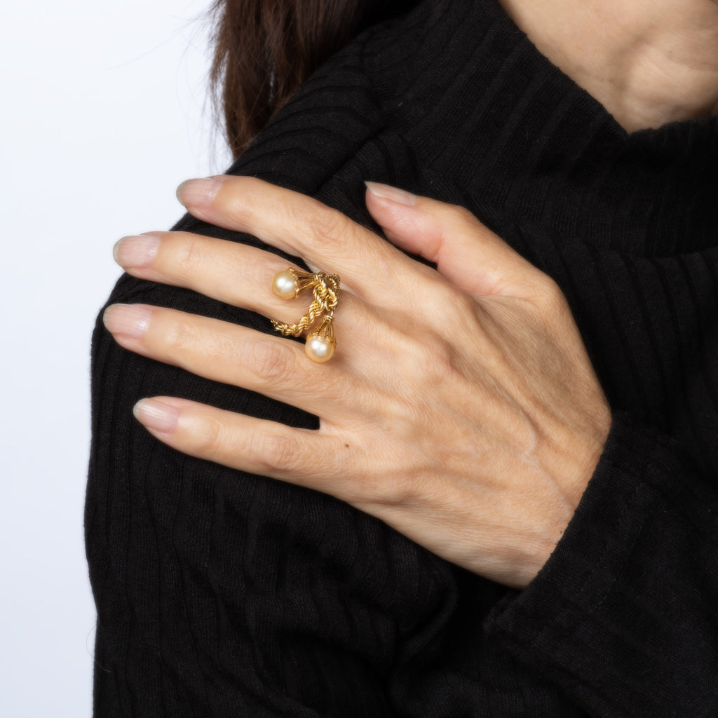 The flexible rope band highlights two cultured pearls suspended from the band, designed to move with you. The ring makes a great statement worn alone or part of a ring stack.