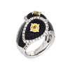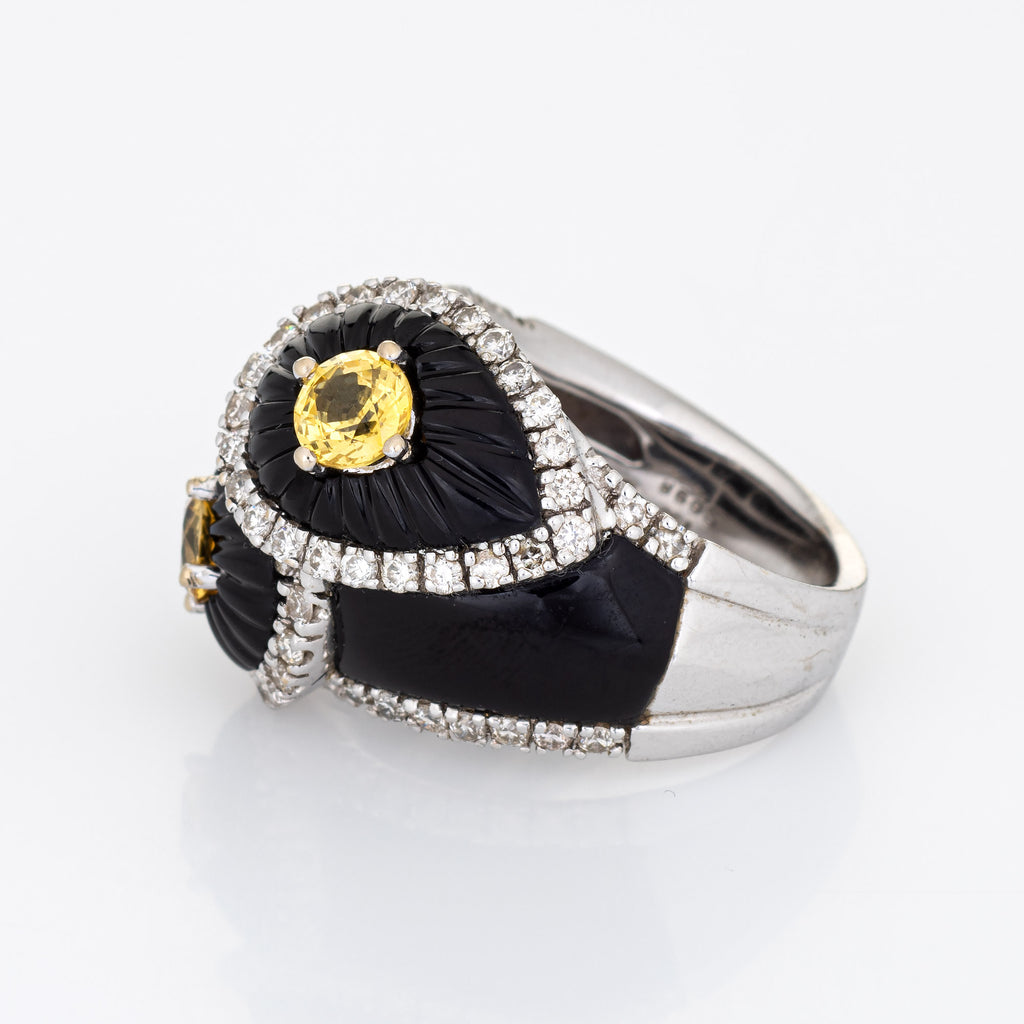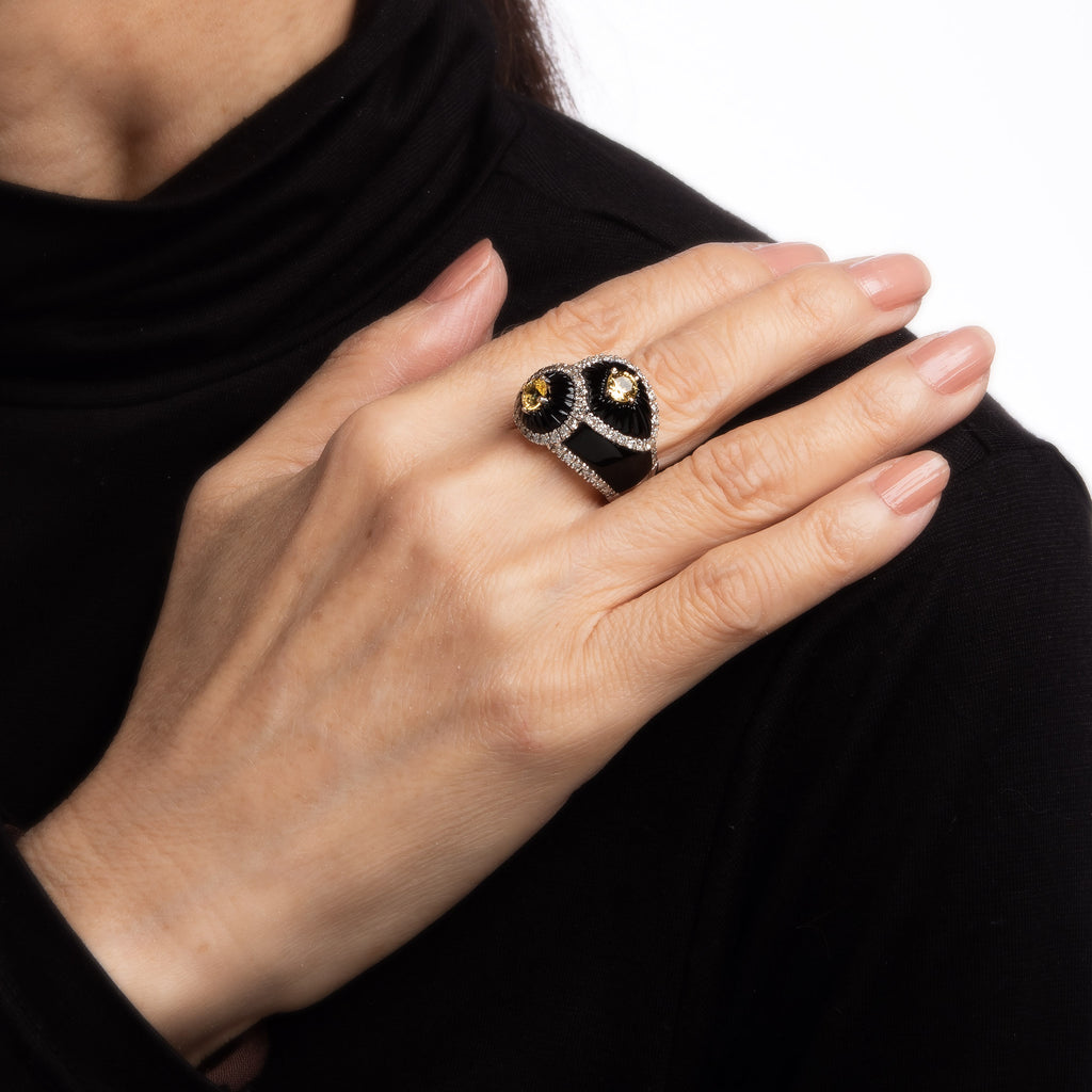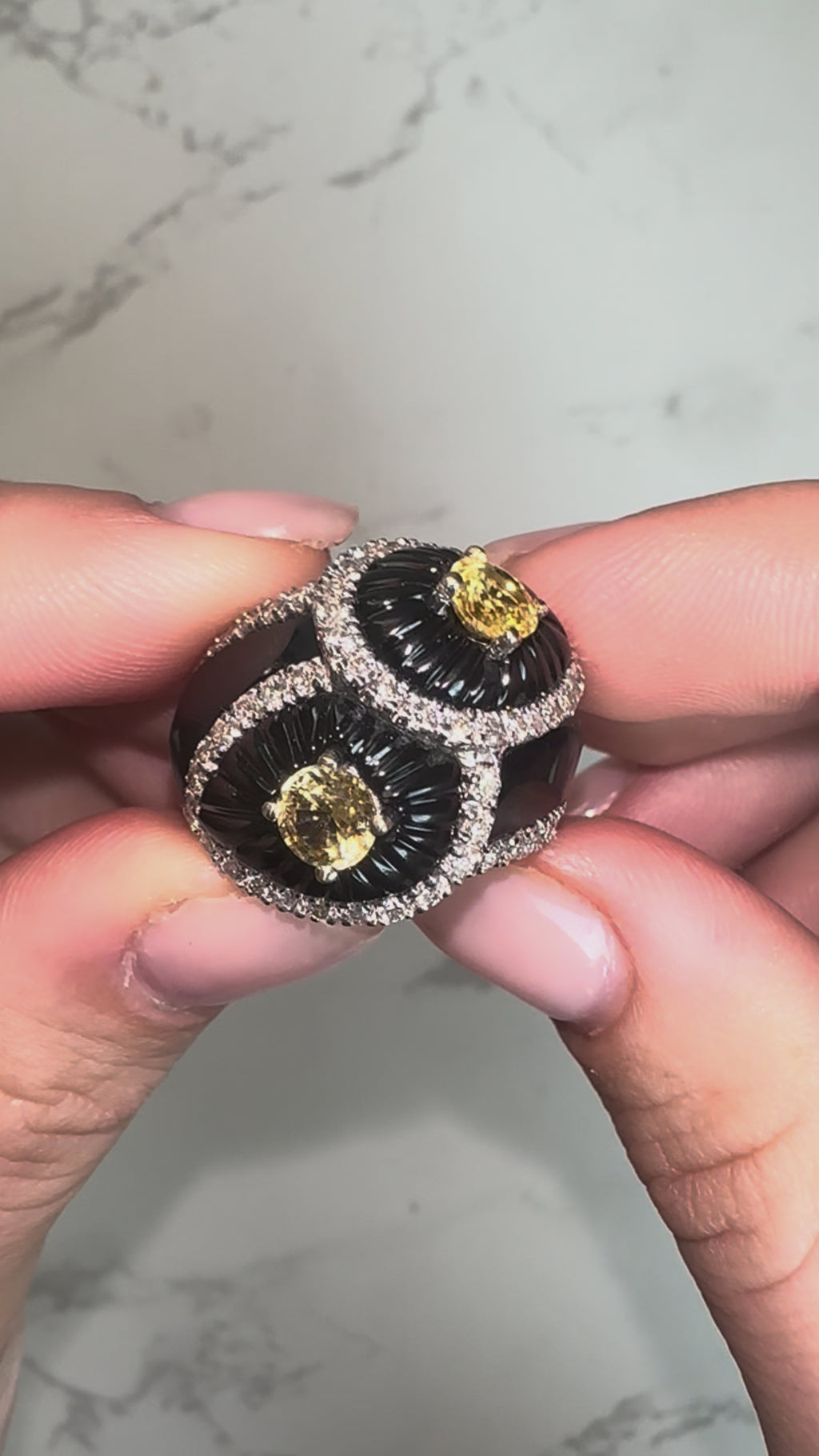 The elaborate and distinct ring highlights two yellow sapphires perched upon fluted onyx mounts, accented with shimmering diamonds. The ring is a visual delight, rich in texture and color contrast. The cocktail ring makes a great statement on the hand. The medium rise ring (10mm - 0.39 inches) sits comfortably on the finger.