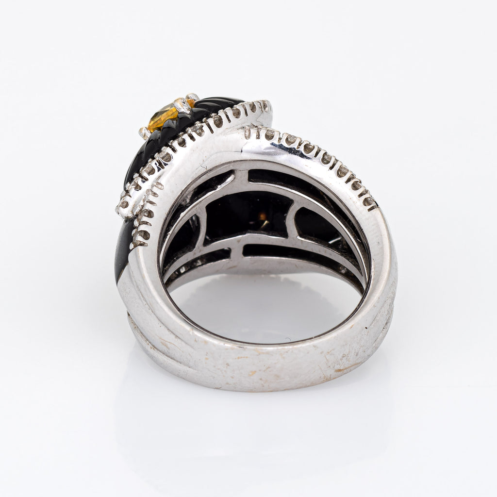 Stylish fluted onyx, yellow sapphire & diamond cocktail ring crafted in 18 karat white gold.