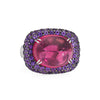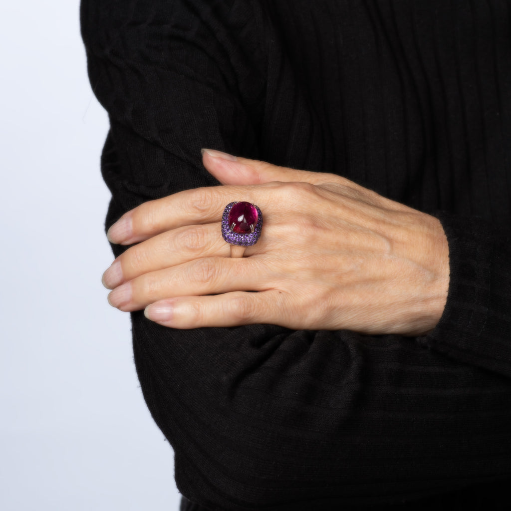 The rubellite's rich rasberry-magenta hue is saturated and alive, glowing with that unmistakable electric warmth only a fine tourmaline can deliver. But what makes this ring truly different is its pairing of pave set purple sapphires. A surprising and fresh combination of gemstones. A ring for someone who loves color! The medium-rise ring (12mm - 0.47 inches) sits comfortably on the finger.