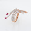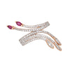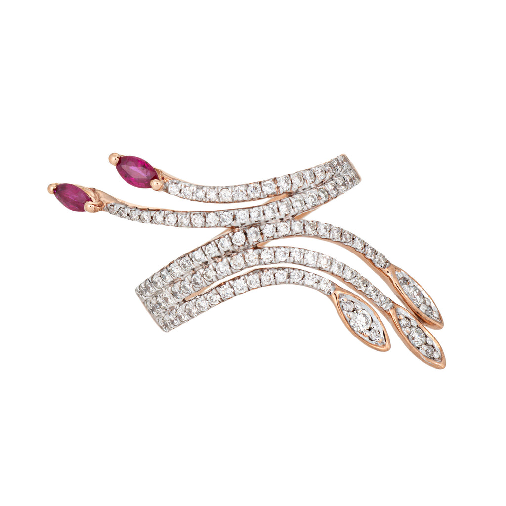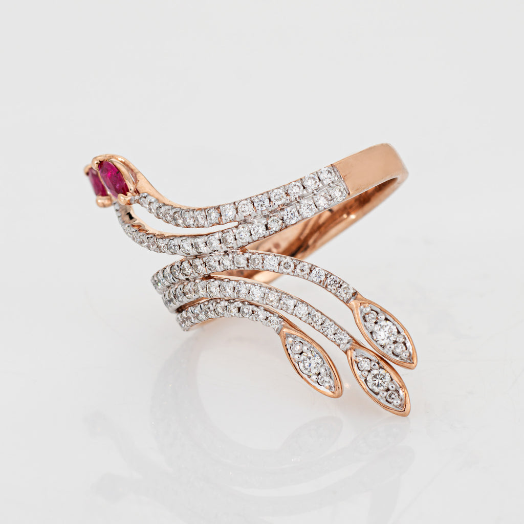 The spray design highlights rich red rubies and shimmering diamonds. The band is curved and designed to hug the finger, sitting flat and comfortably on the finger. The ring makes a great statement on the hand.
