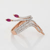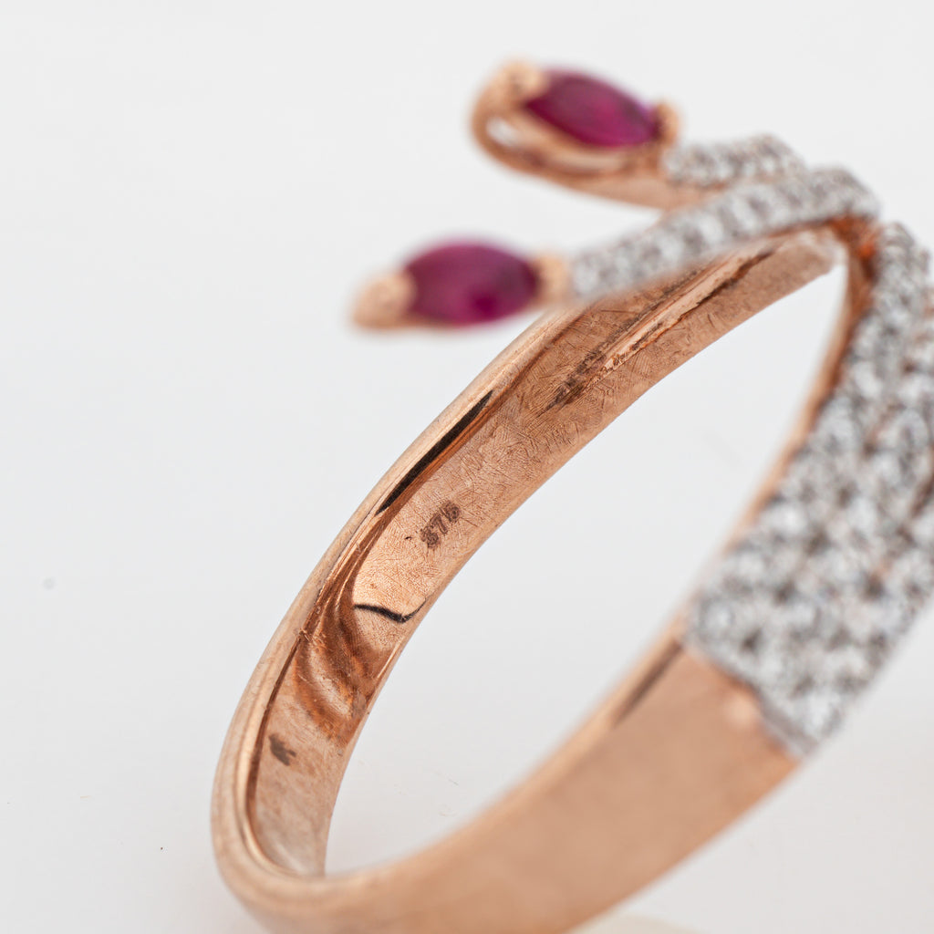 Stylish contemporary ruby & diamond spray ring crafted in 9 karat rose gold.