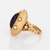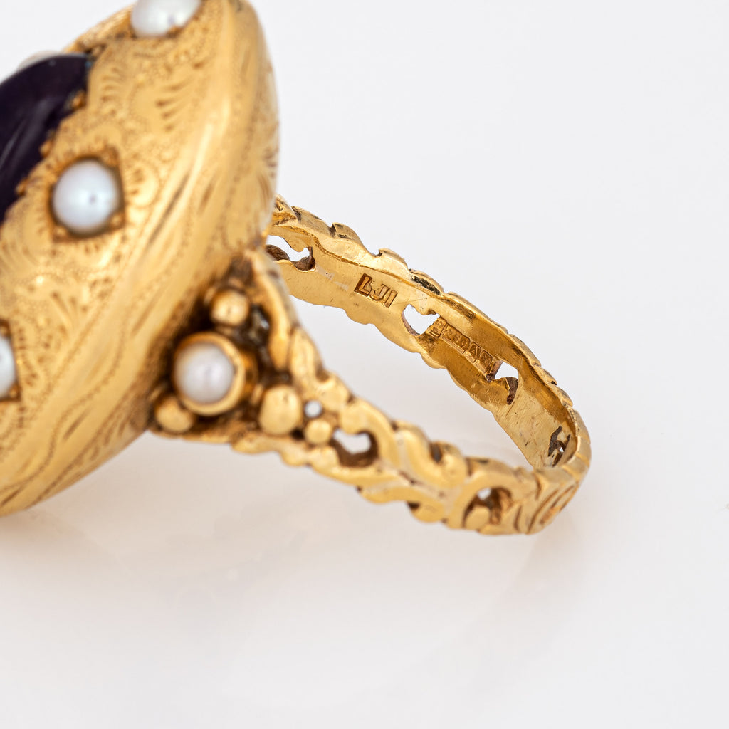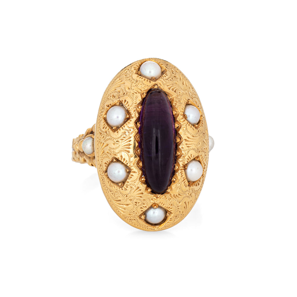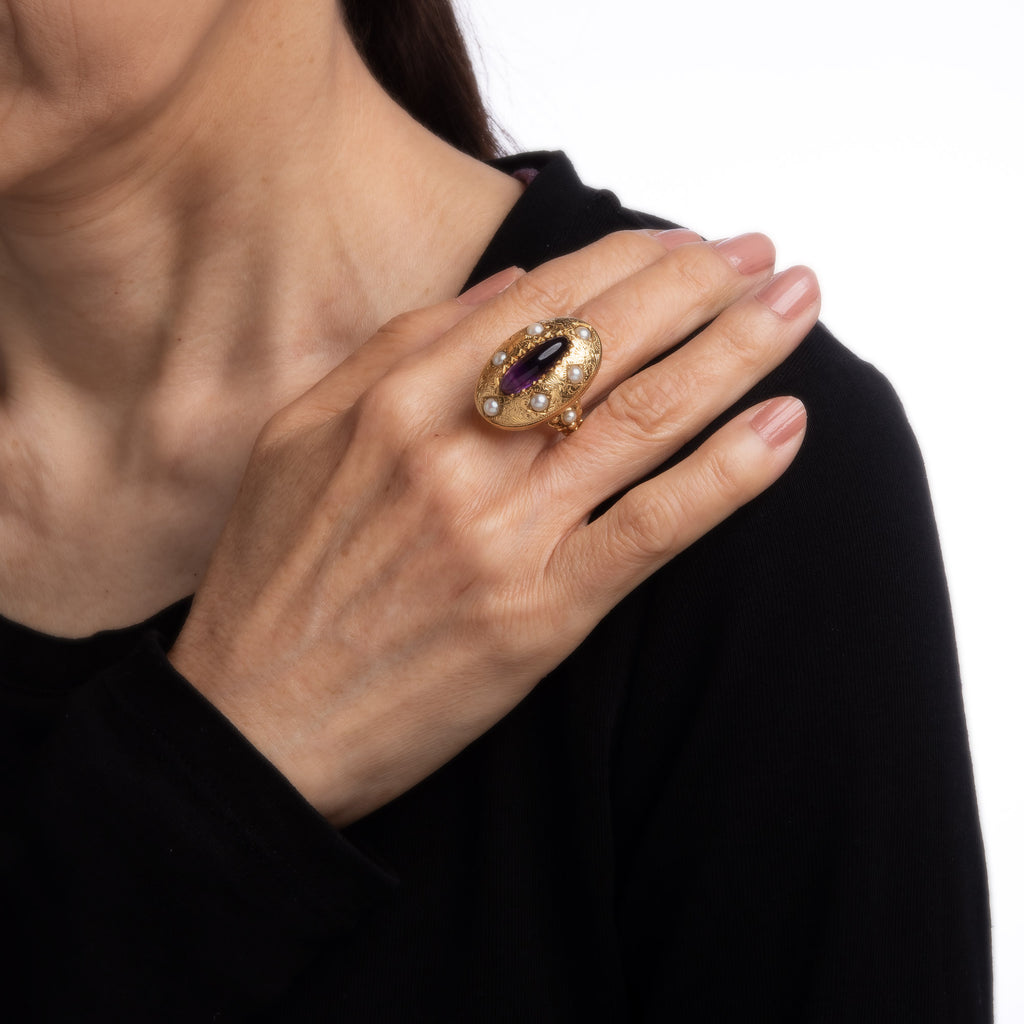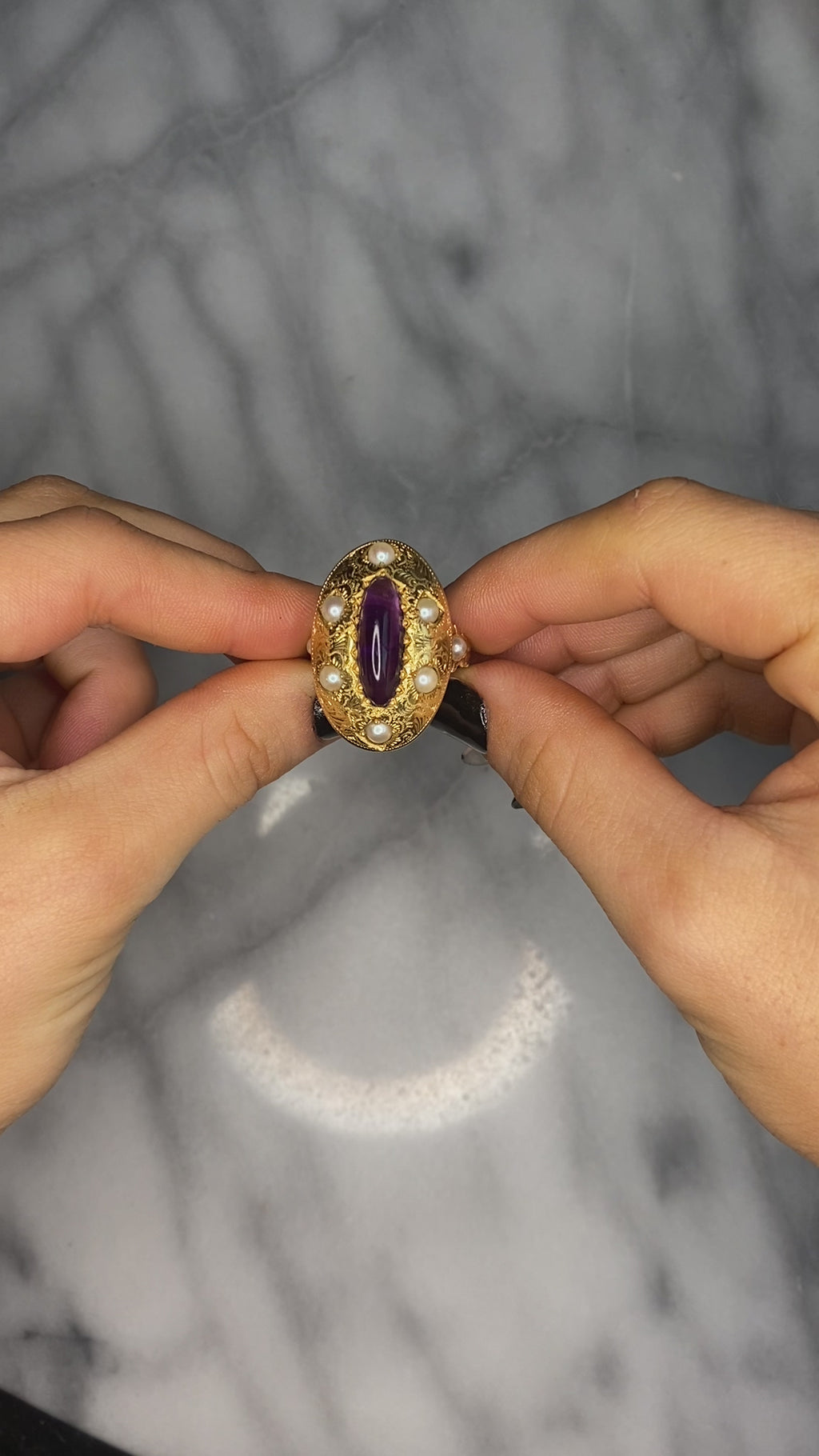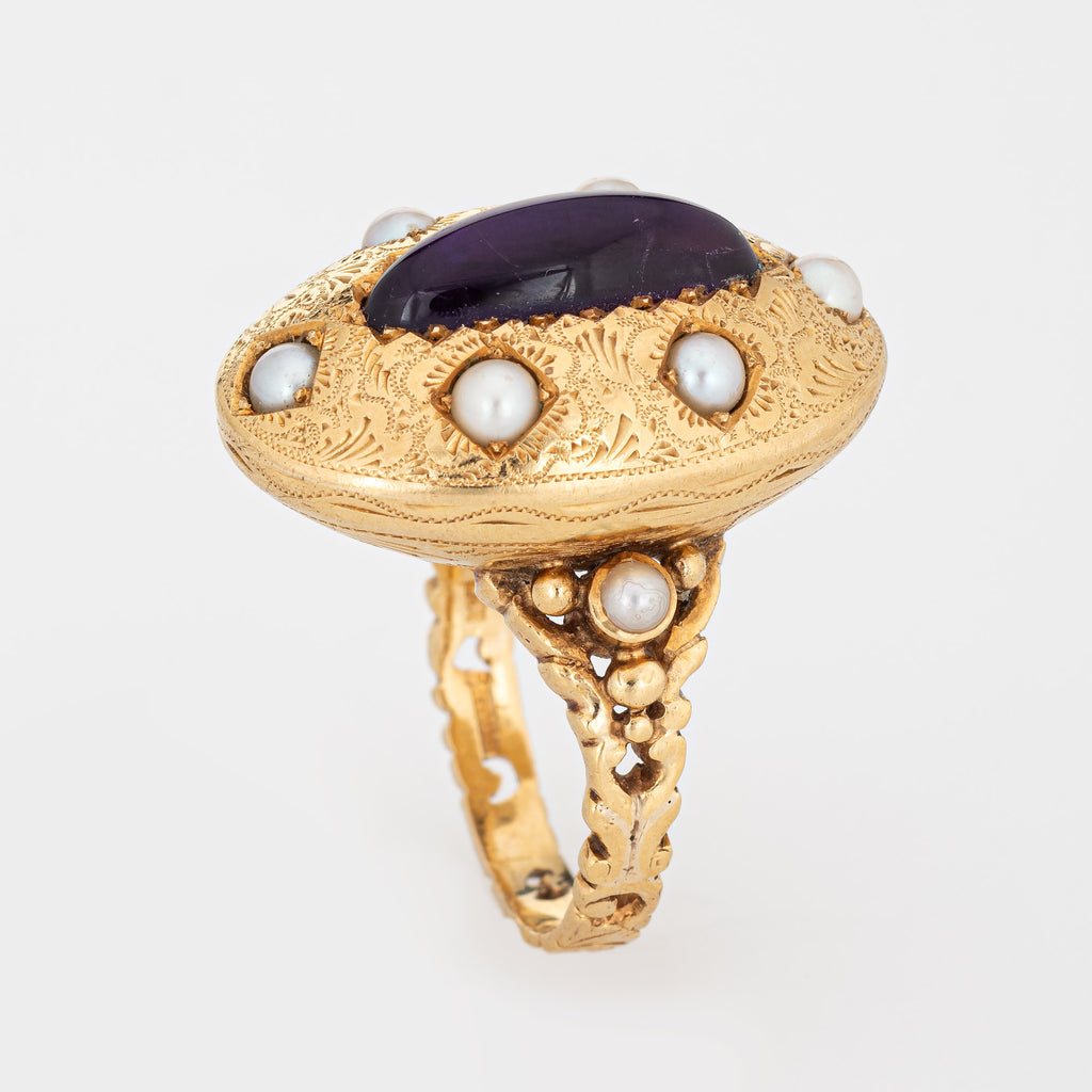 The striking ring highlights an elongated rich royal purple amethyst to the center, with accenting pearls. With elaborate hand etched details to the oval mount and a scrolled motif band, the ring is a feast for the eyes. The high rise ring (16mm - 0.62 inches) sits comfortably on the finger.
