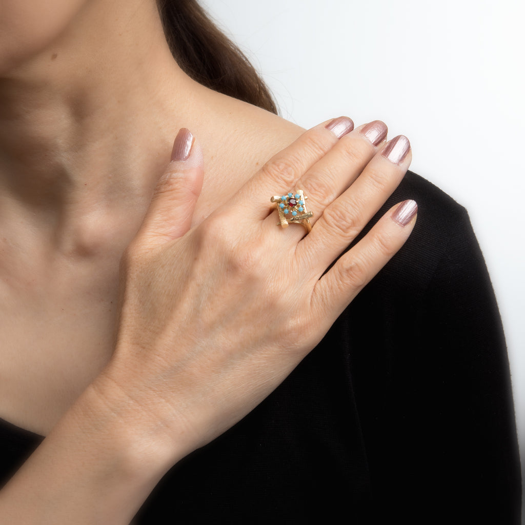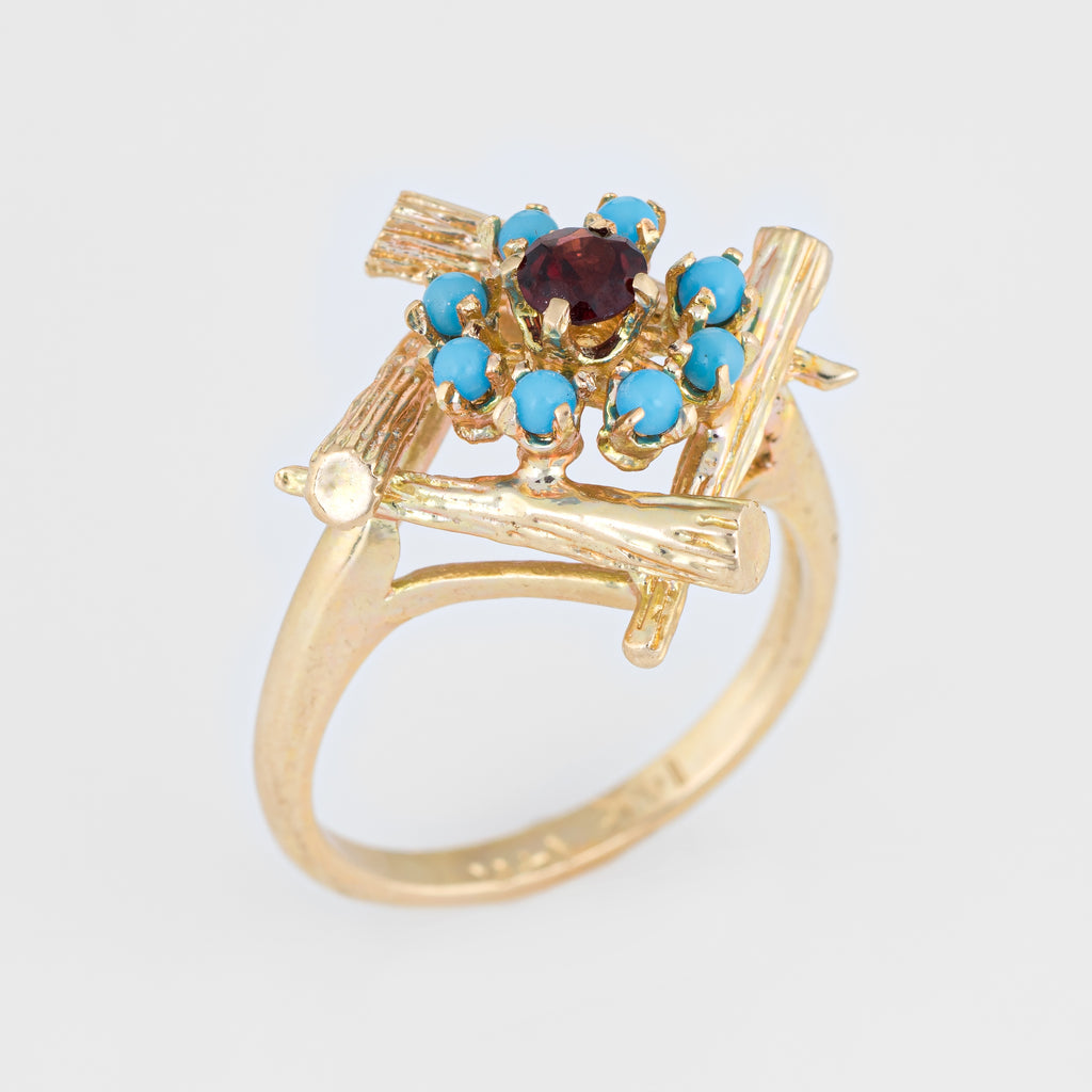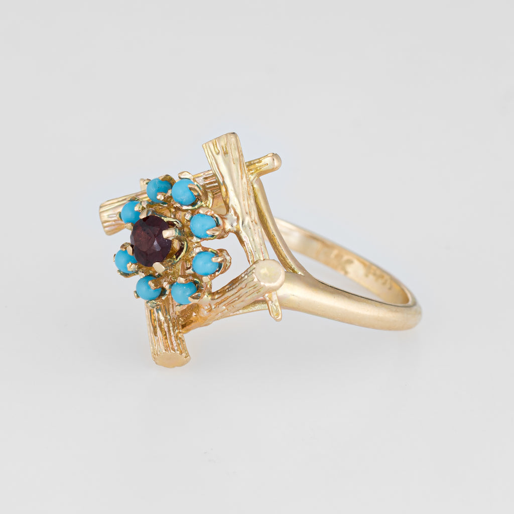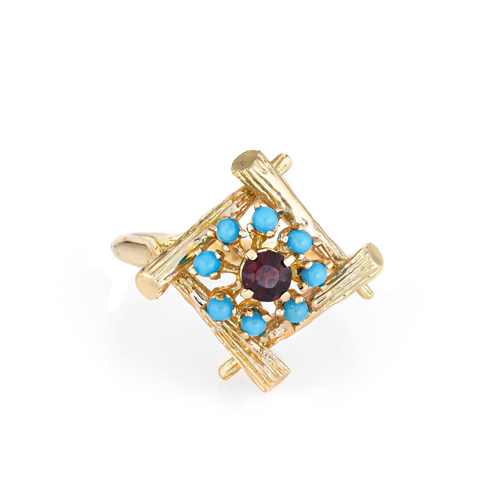 The stylish vintage ring features a four sided bamboo design that highlights the garnet and turquoise. The colorful ring is impactful in design and ideal worn day or night.