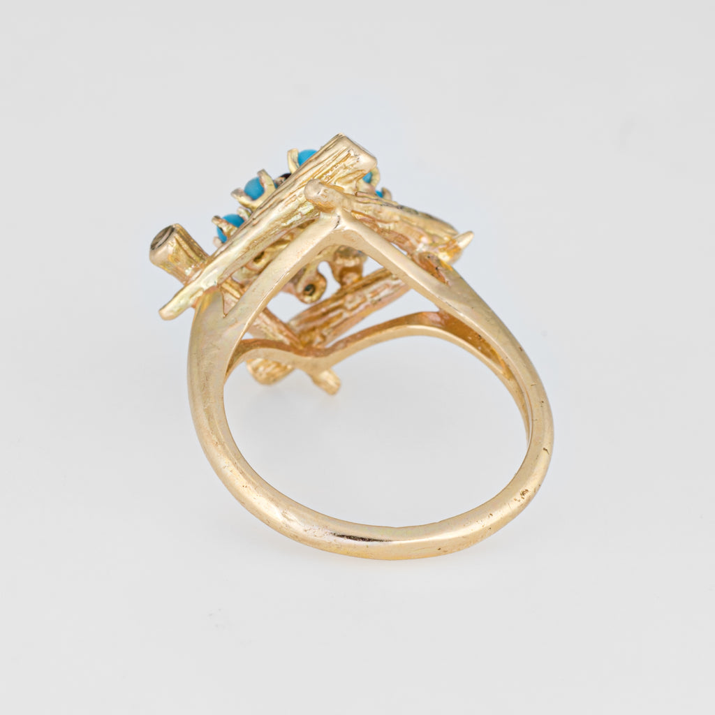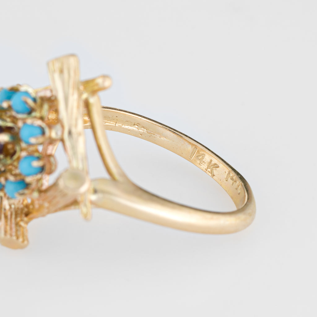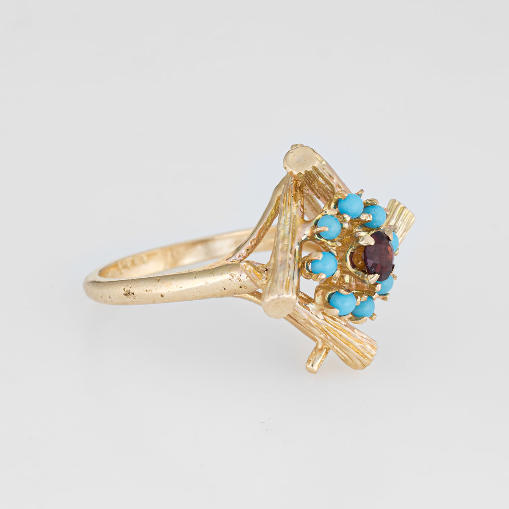 Finely detailed vintage turquoise & garnet cocktail ring (circa 1970s), crafted in 14 karat yellow gold.