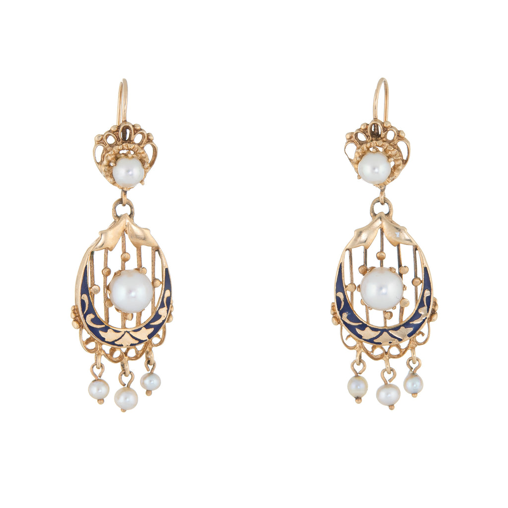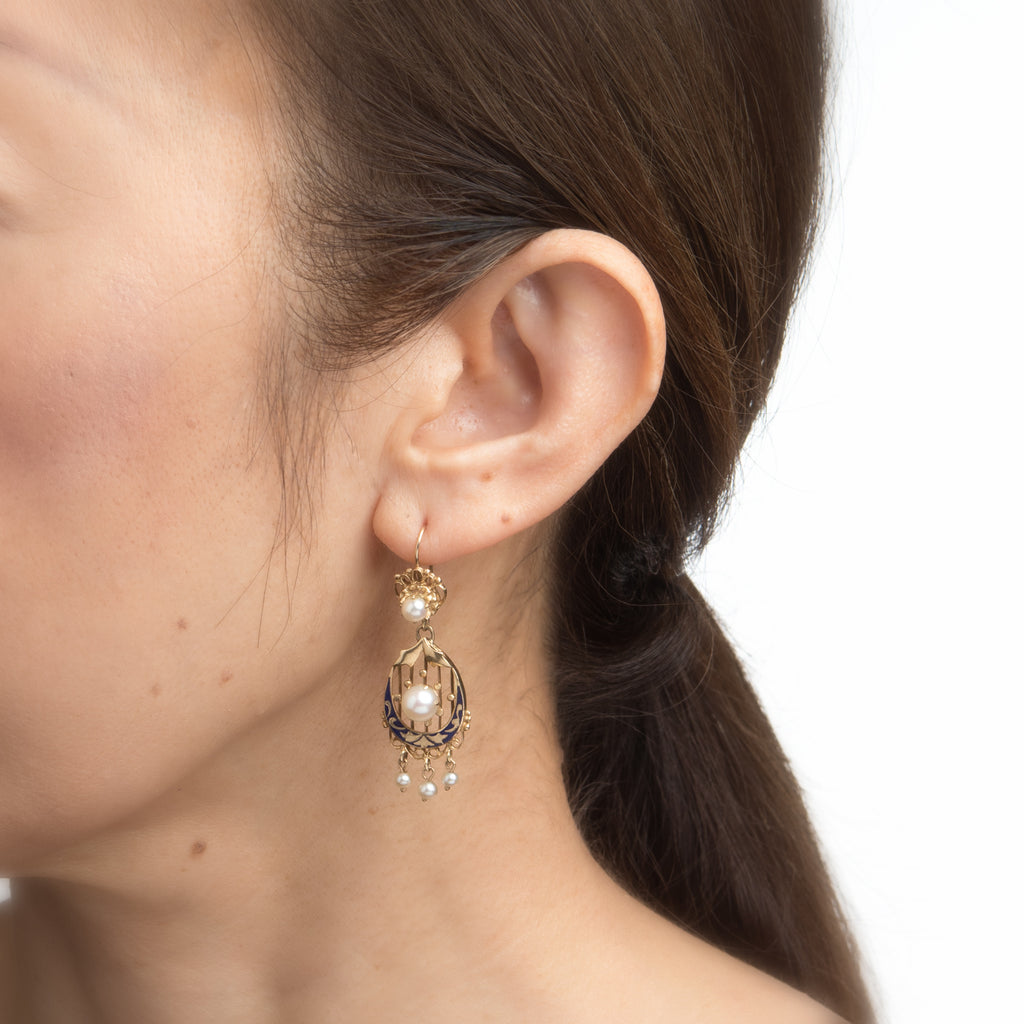 The charming earrings feature an ornate design with a fringe of pearls to the base and decorative blue enamel. The earrings can easily transition from day to evening wear. The earrings are fitted with fish wire hook backings for pierced ears.