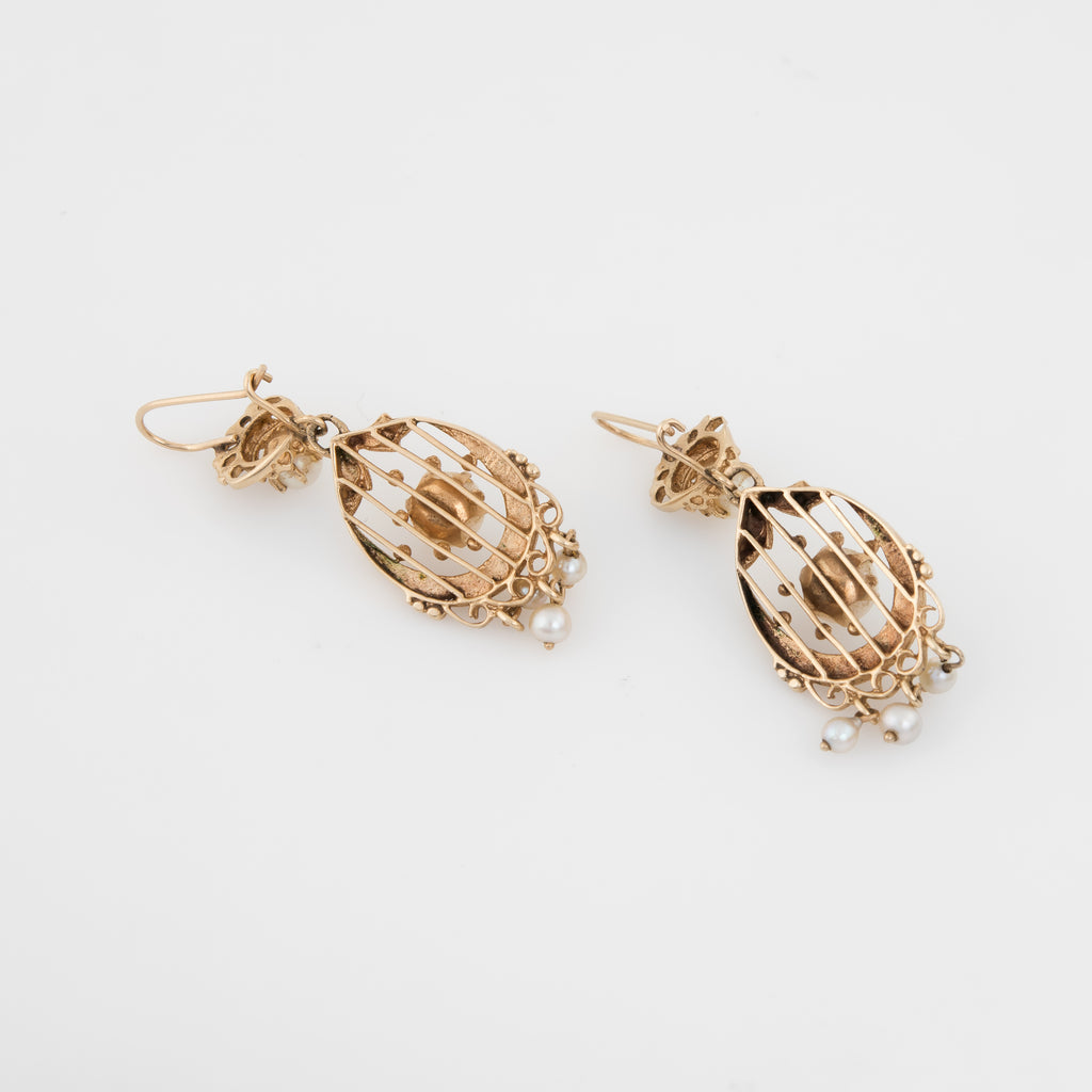 Vintage Drop Earrings Cultured Pearls Enamel 14k Yellow Gold Estate Jewelry