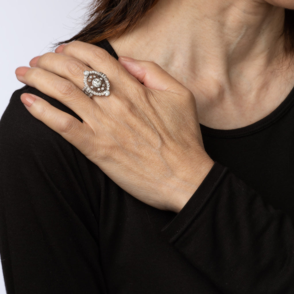 This one is for the books! A spectacular Edwardian era dinner ring highlights a bright and lively center set old European cut diamond, with a surround of shimmery diamonds set into an open work lattice mount. The cocktail ring is larger in scale (north to south measuring 24mm - 0.94 inches) and makes a great statement on the hand. The low rise ring (4.5mm - 0.17 inches) sits flat and comfortably on the finger. The original Edwardian era ring is a feast for the eyes!