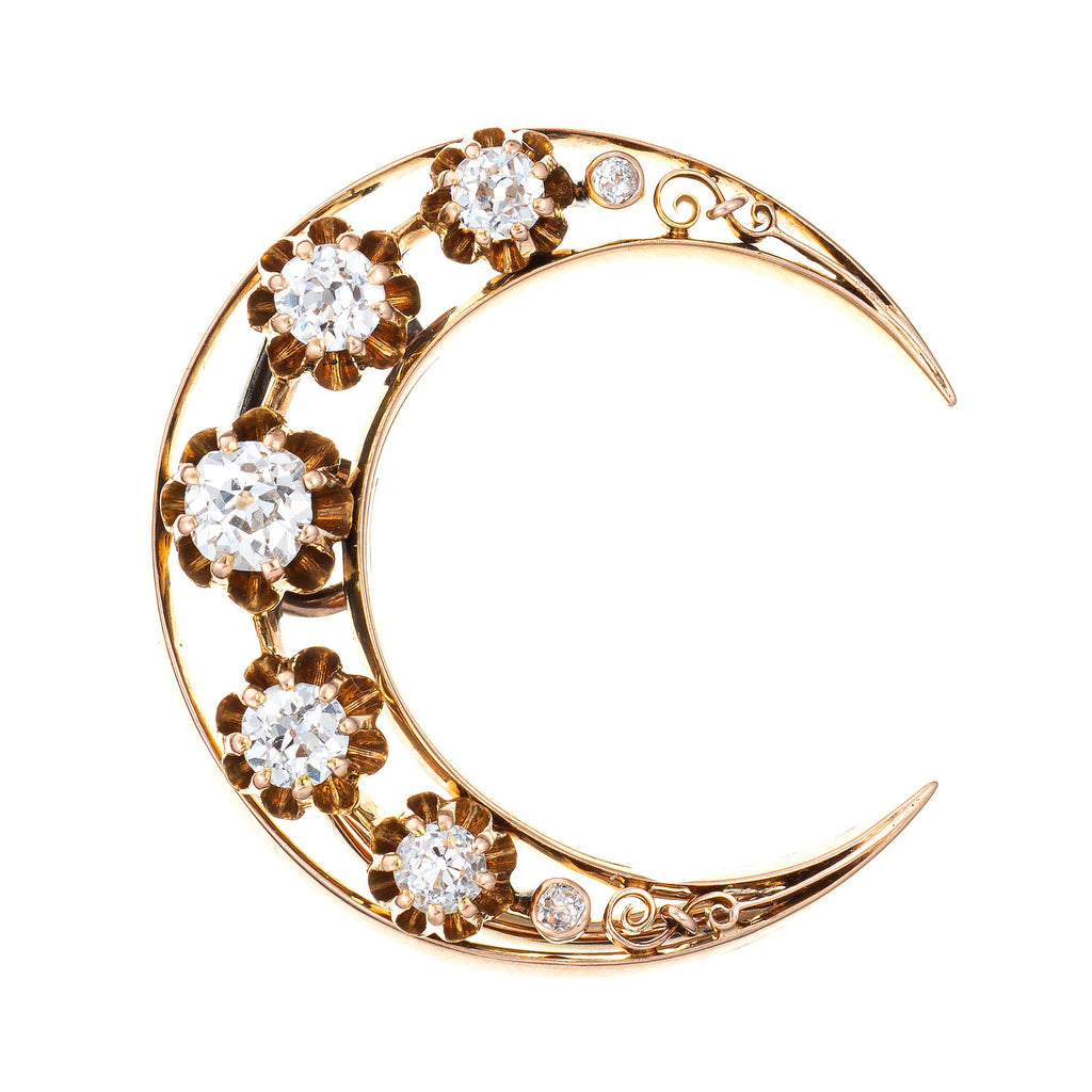 Set into a classic crescent moon motif, the old mine cut diamonds glimmer, arranged to create a celestial effect, evoking a shimmering night sky. Also wearable as a brooch, the versatile piece is great worn on a lapel or cuff in addition to a bale that can accommodate a chain for wear as a necklace.