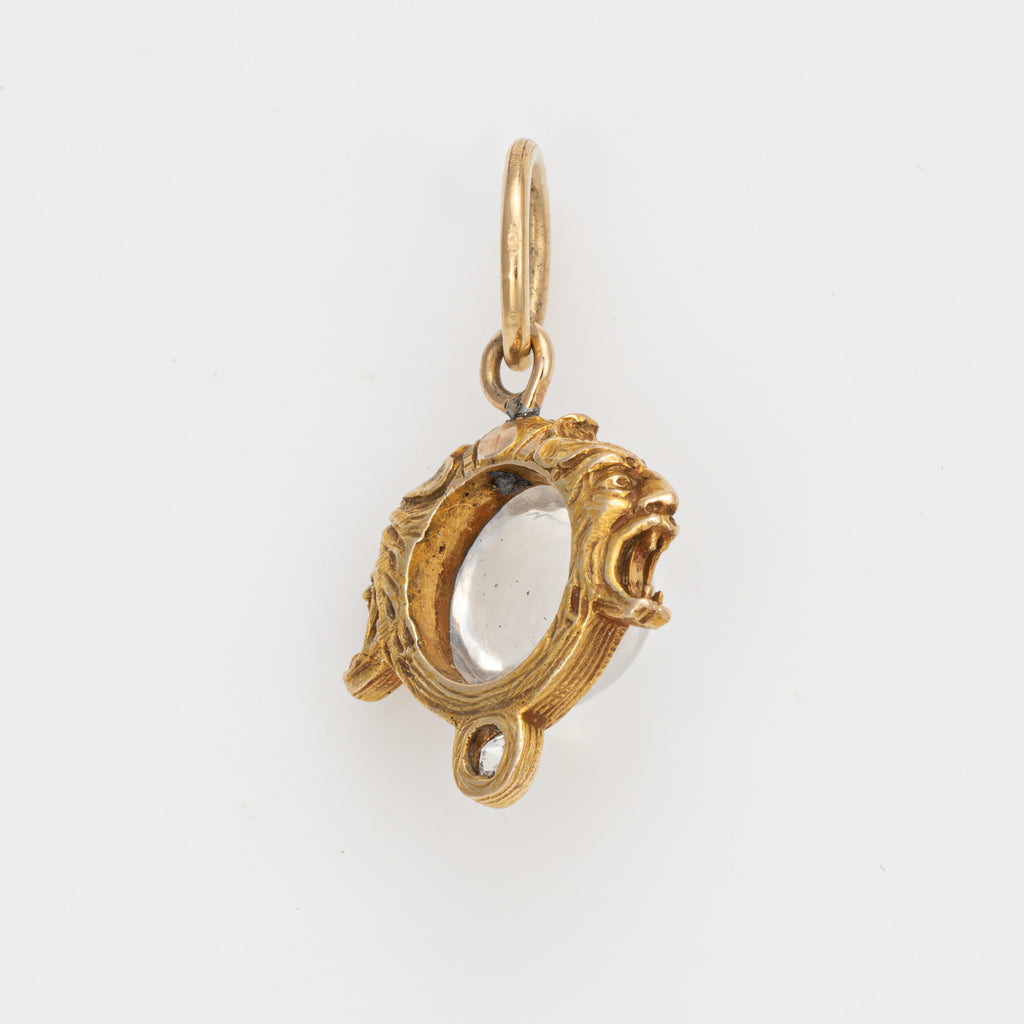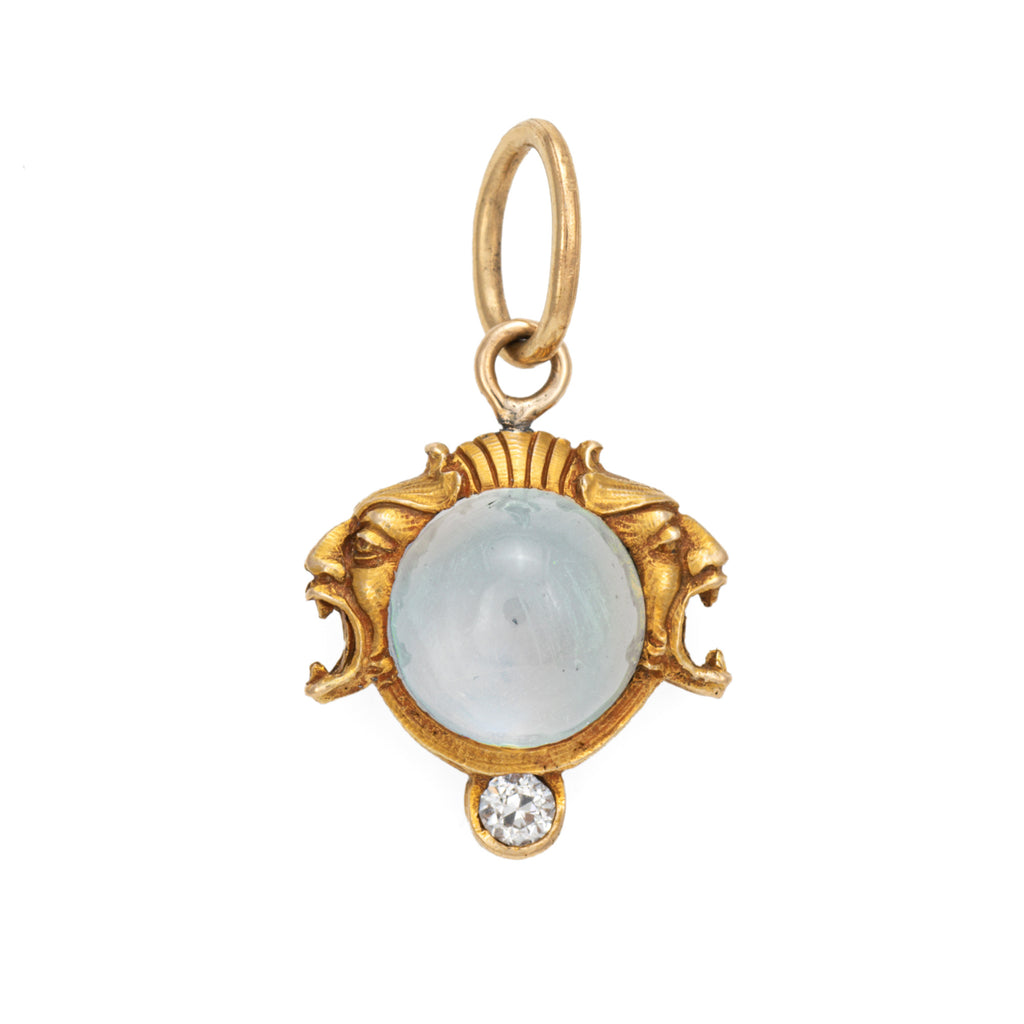 The beautifully detailed pendant is set with a luminous rainbow moonstone to the center with a small old mine cut diamond to the base. The sides of the pendant feature Gargoyles, symbolizing guardianship and to ward off evil spirits. The pendant is a lovely example of Art Nouveau era jewelry when mystical creatures were popular themes in jewelry design. The piece is a component that was converted (most likely from a stick pin) to its current form as a small pendant (also wearable as a charm).