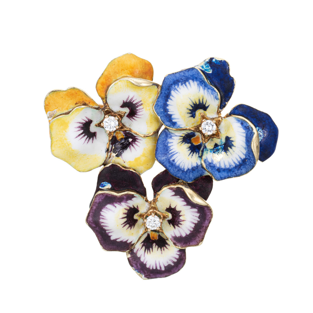 Three enameled pansy flowers in shades of yellow, blue and purple make a lovely statement. Wearable as a brooch or a pendant the versatile piece is a great example of Art Nouveau era jewelry when flora and fauna were prominent in jewelry design. The enamel is in good condition with some minor loss to the enamel at the outer edges of the petals. We have not cleaned the brooch/pendant in order to preserve the patina and collector value.