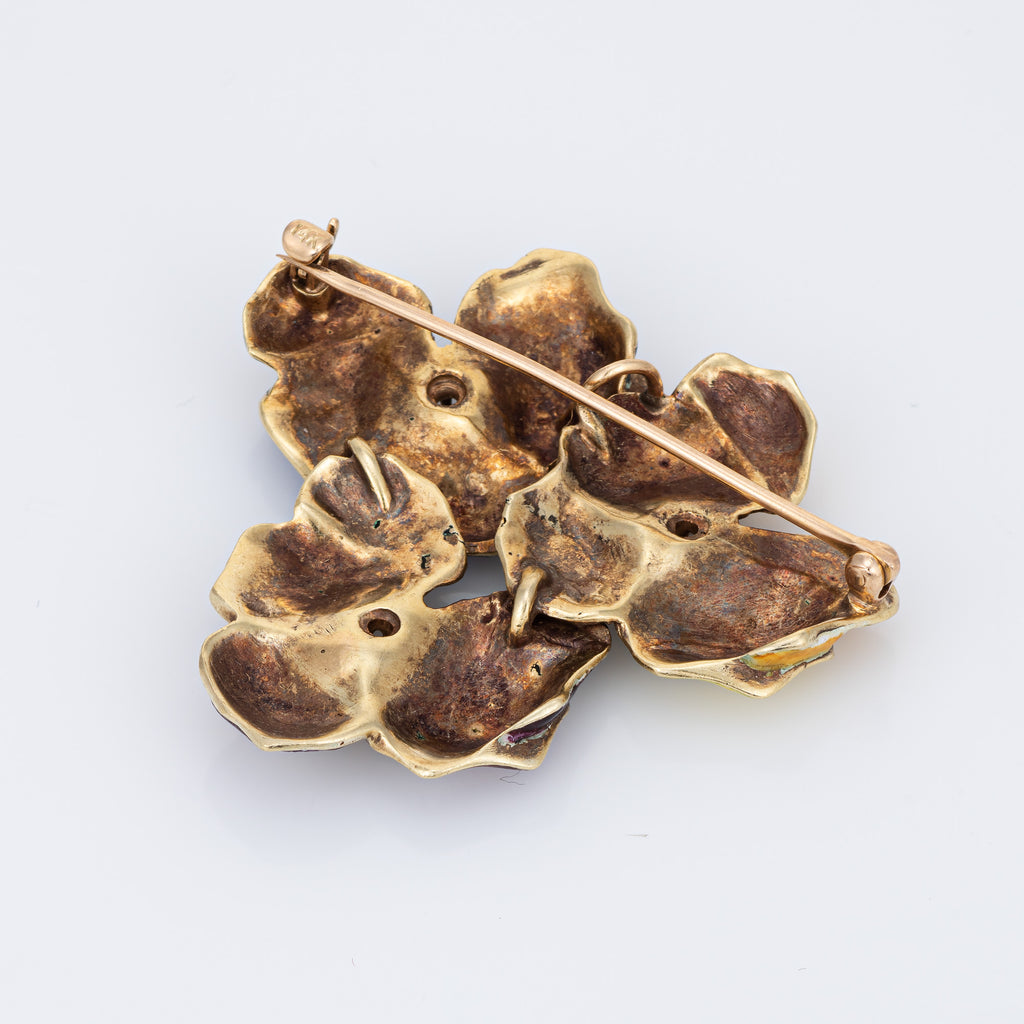Finely detailed antique Art Nouveau enameled pansy brooch/pendant (circa 1900s to 1910s), crafted in 14 karat yellow gold.