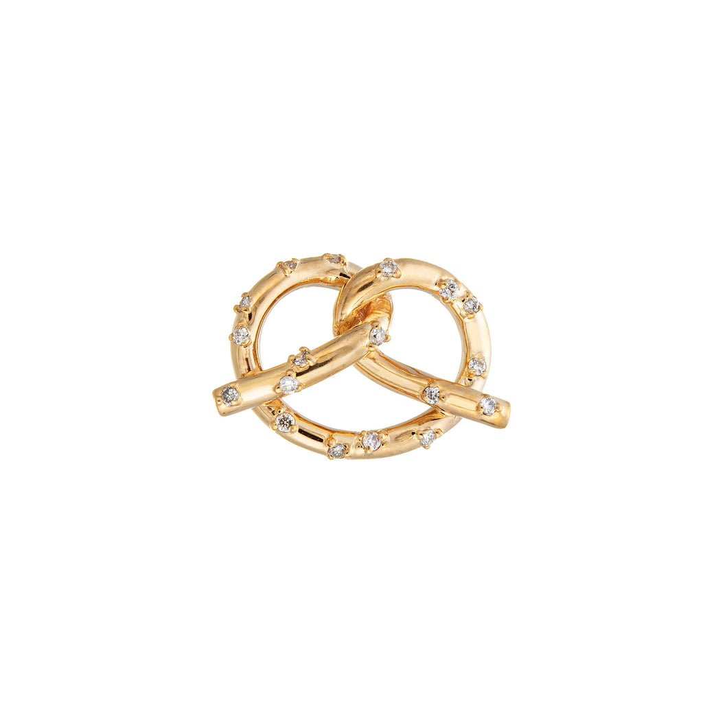 The ever-popular pretzel is a tasty staple. Diamond "salt" is set in random form giving a lifelike appearance to pendant. Small in scale the piece is great worn as a pendant on a chain or attached to a charm bracelet.