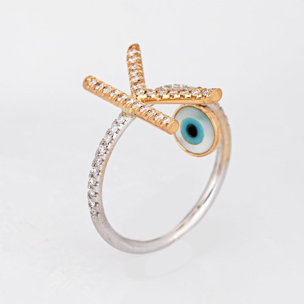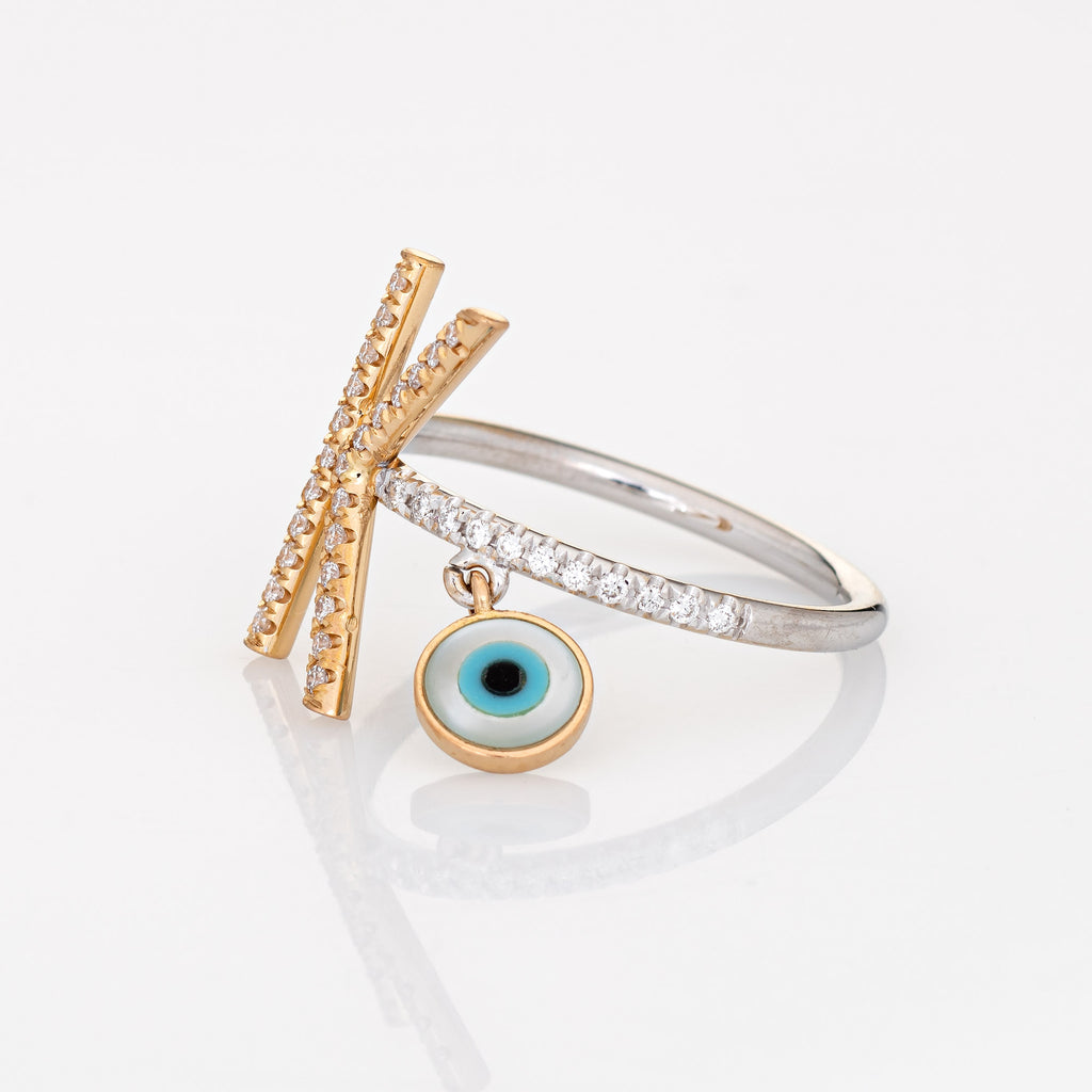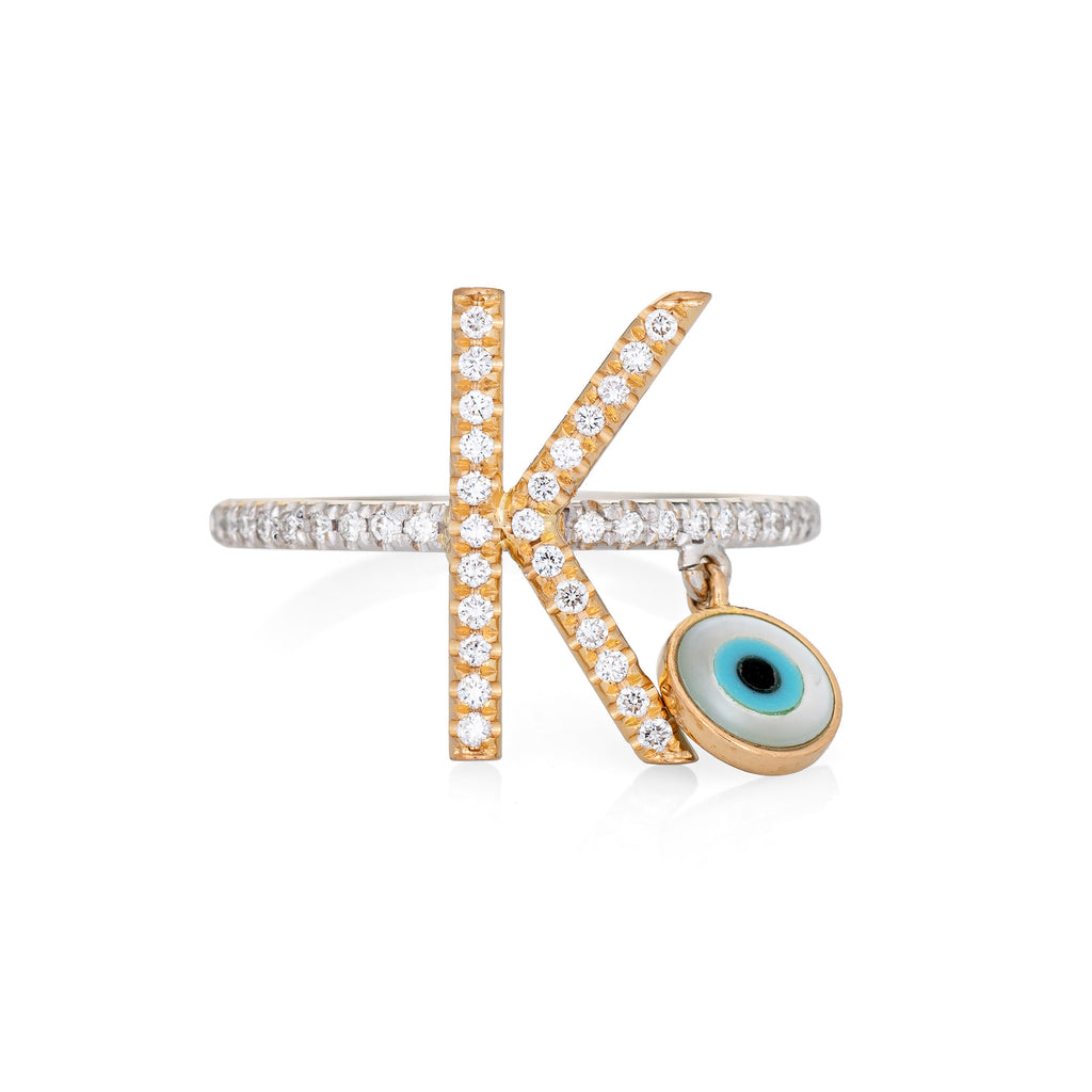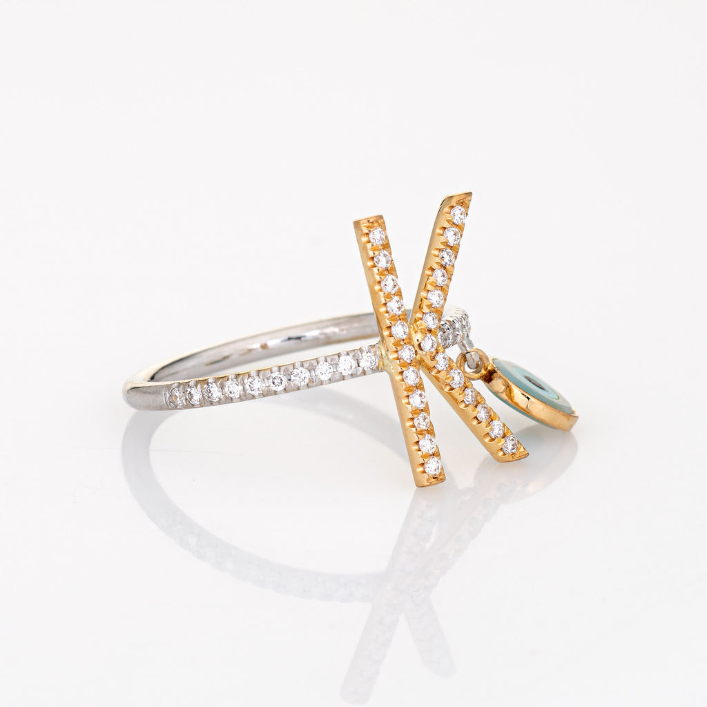 Stylish letter "K" diamond evil eye charm ring, crafted in 14 karat white & yellow gold.