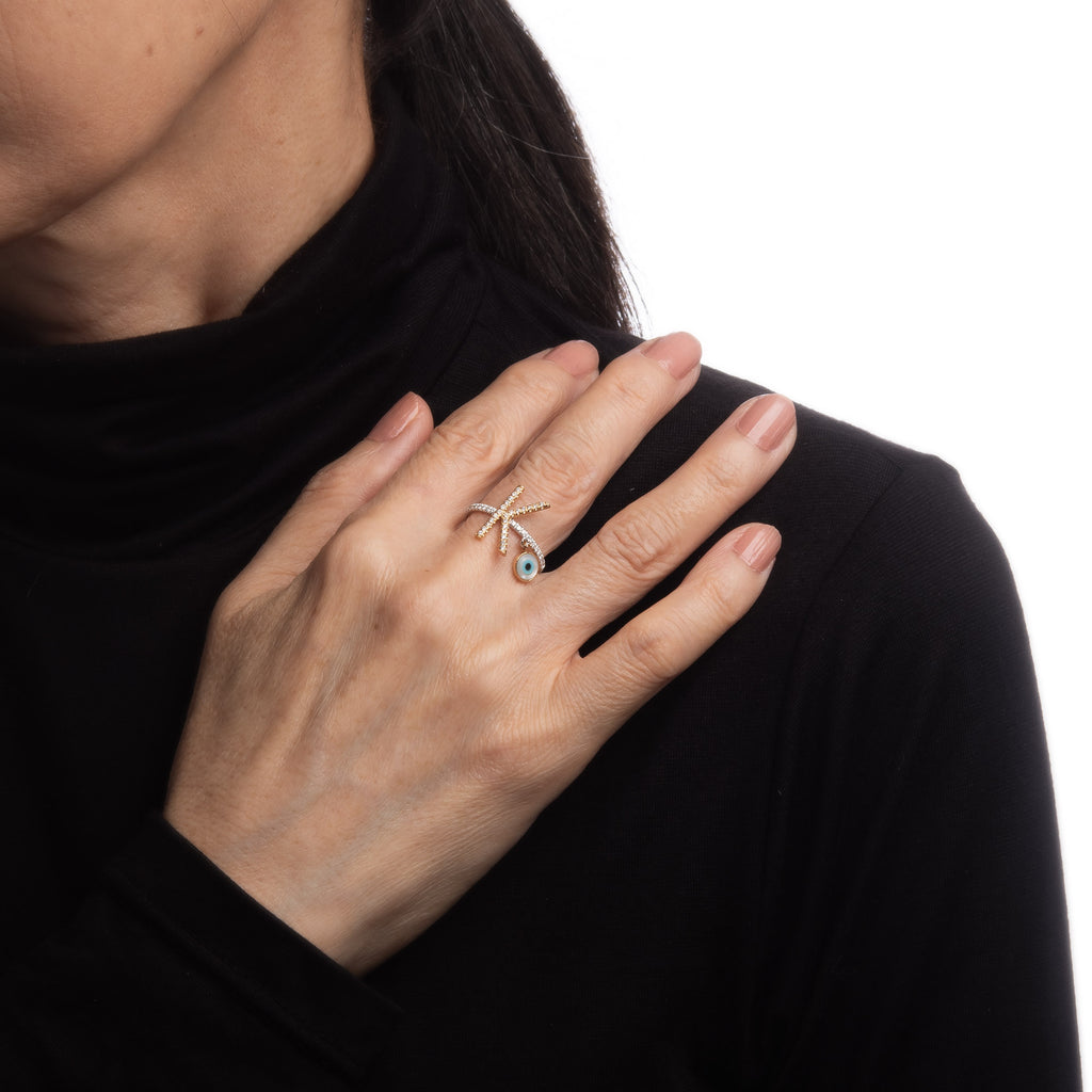 The letter 'K' is pave set with diamonds, with an evil eye charm set to the side of the band. The ring makes a nice statement on the hand. The low rise ring (3mm - 0.11 inches) sits comfortably on the finger.