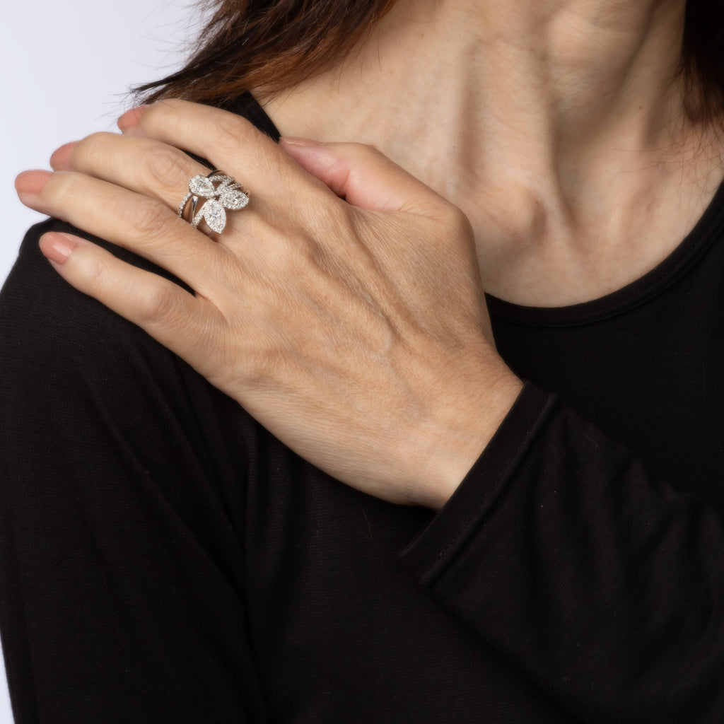 The beautiful band highlights shimmering mixed cut diamonds. The wide band cocktail ring makes a nice statement on the hand. The low rise ring (3.5mm - 0.13 inches) sits comfortably on the finger.