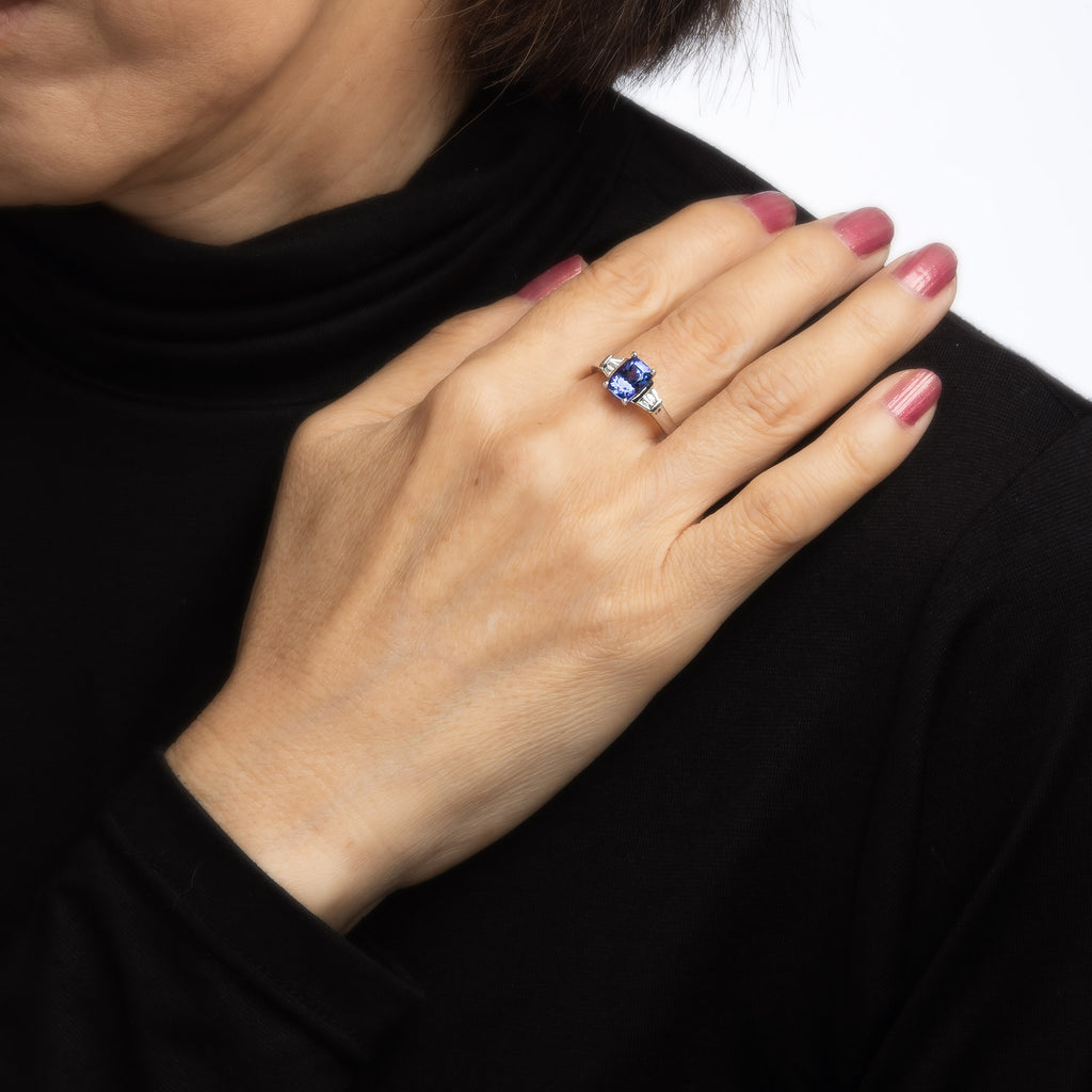 Stones: Cushion cut tanzanite measures 8mm x 6mm (1.78 carats). Four estimated 0.10 carat tapered baguette cut diamonds total an estimated 0.40 carats (estimated at G-H color and VS2 clarity). The tanzanite is in excellent condition and free or cracks or chips).