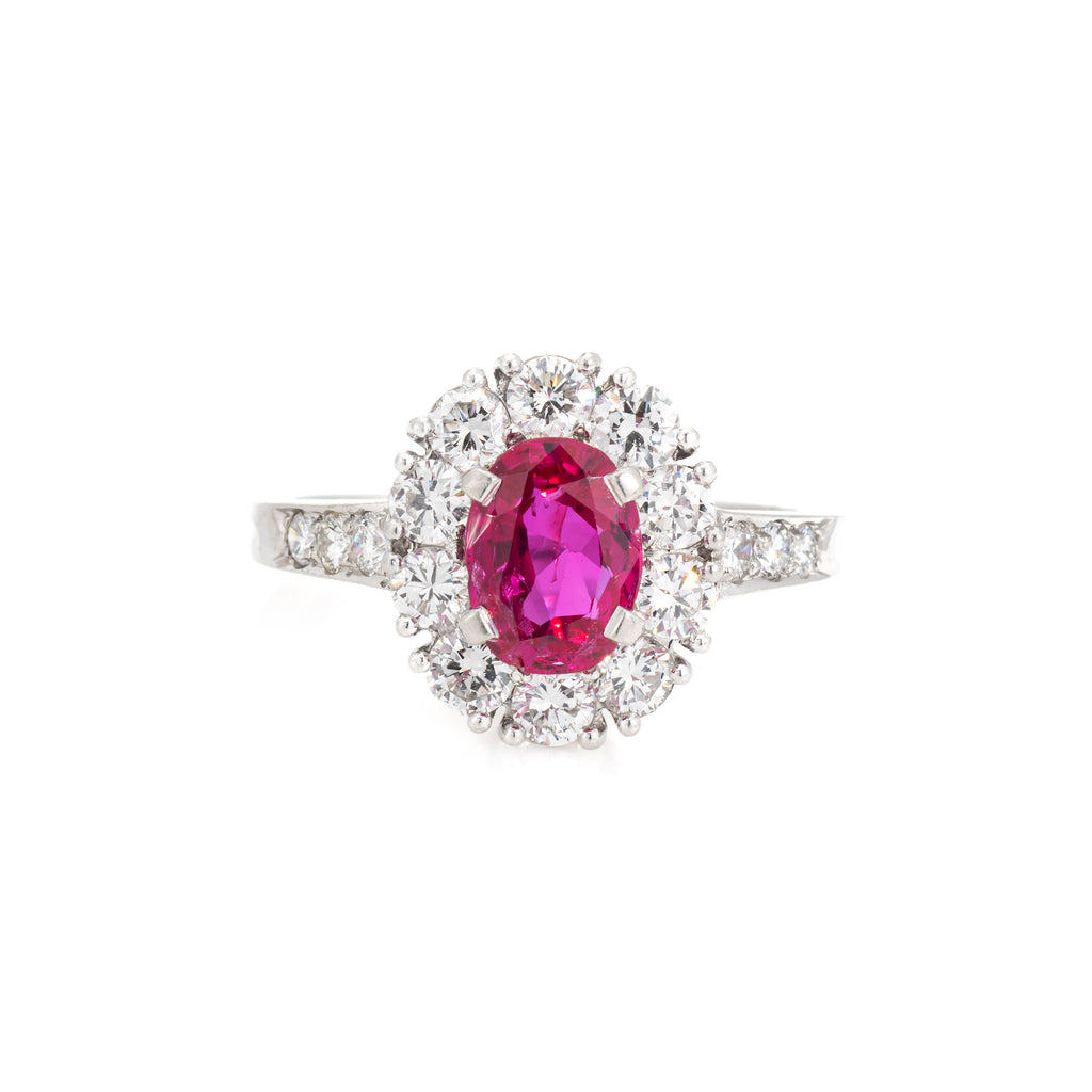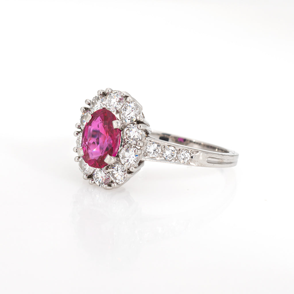 Oval brilliant cut Ruby measures 7.21 x 5.42 x 3.05mm (estimated at 1 carat). The ruby is natural Corundum and is Burma (Myanmar) in origin. No indication of Heating to the Ruby. Sixteen diamonds total an estimated 0.70 carats (estimated at F-G color and VS clarity). The ruby is in good condition with two tiny chips evident (visible under a 10x loupe).
