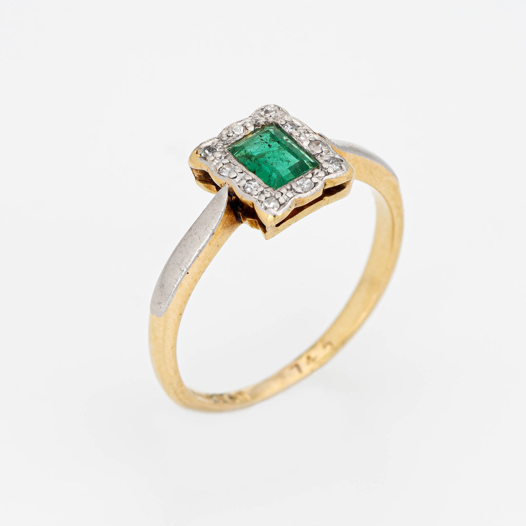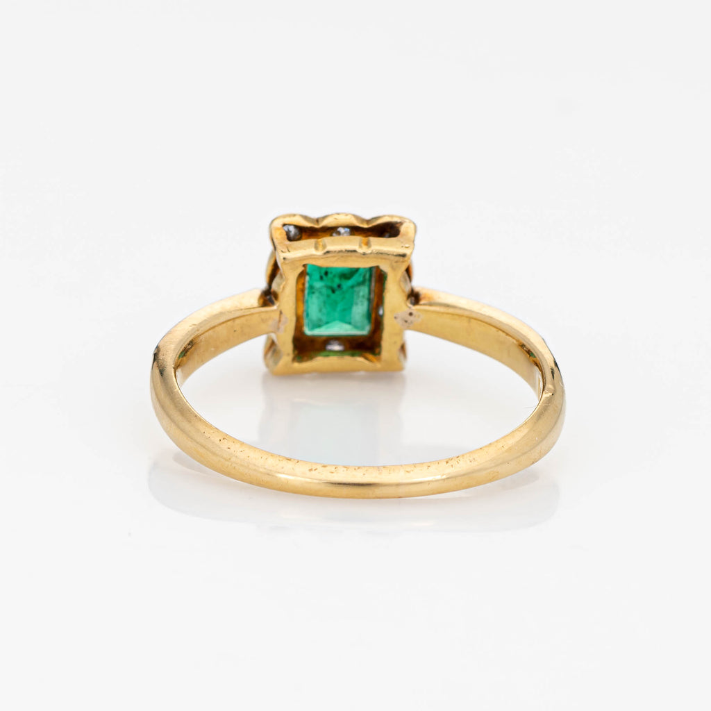 Finely detailed antique Victorian emerald & diamond engagement ring (circa 1880s to 1900s) crafted in 18 karat yellow gold and platinum.