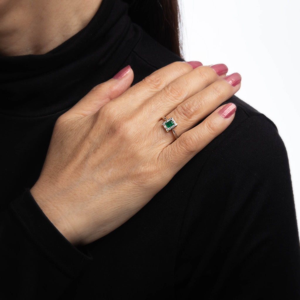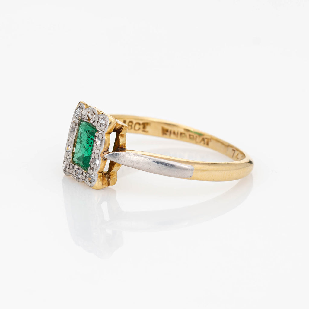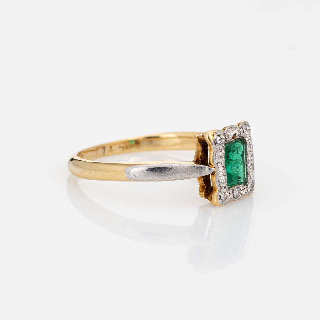 Stones: One emerald cut emerald measures 5mm x 3.5mm (estimated at 0.33 carats). The emerald is in good condition and free of cracks or chips. Ten old single cut diamonds total an estimated 0.05 carats (estimated at H-I color and SI1-I1 clarity).