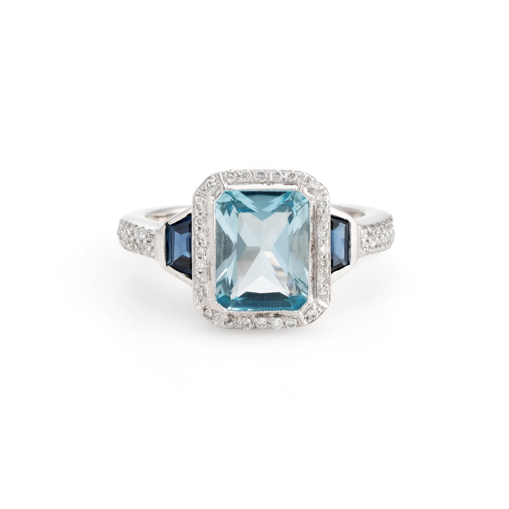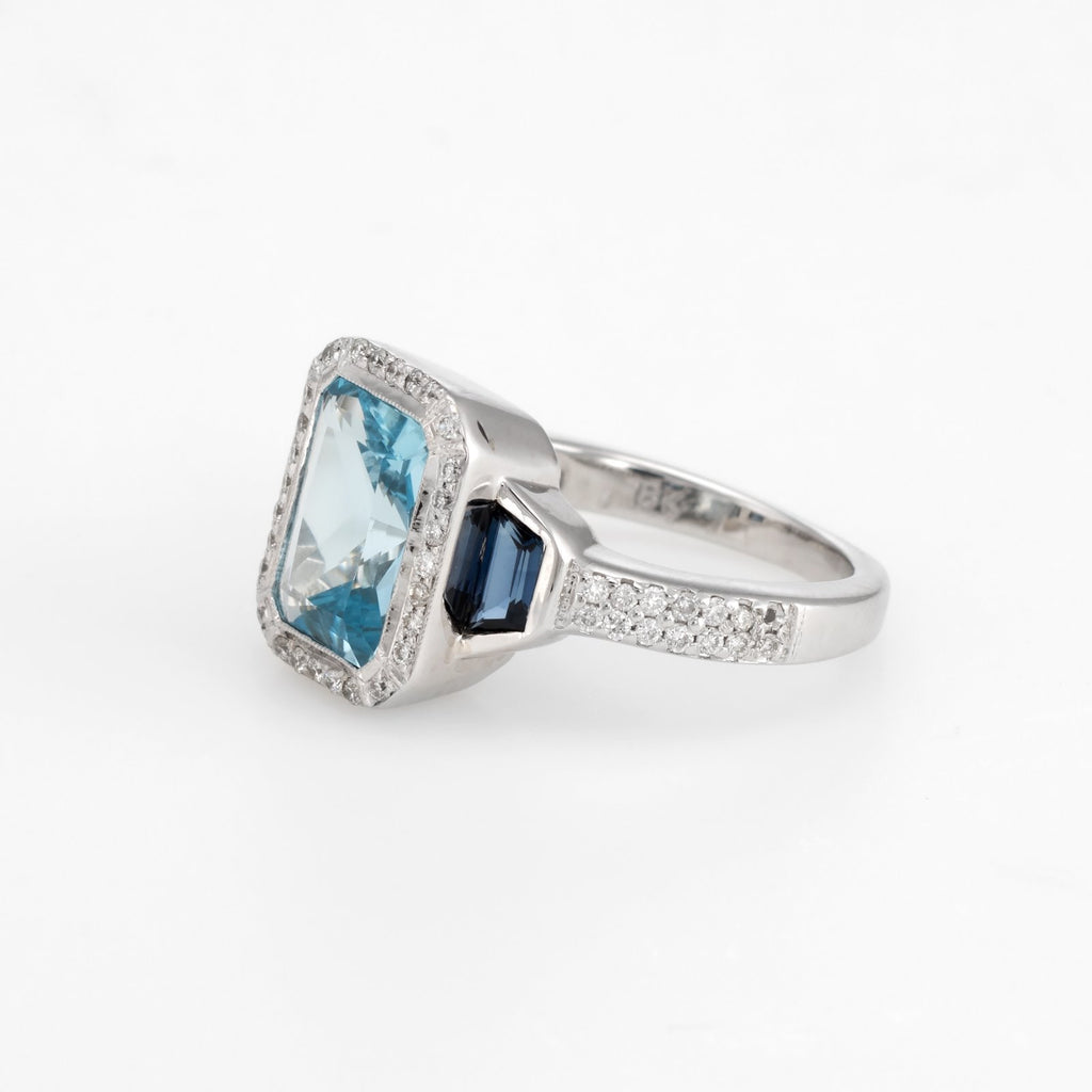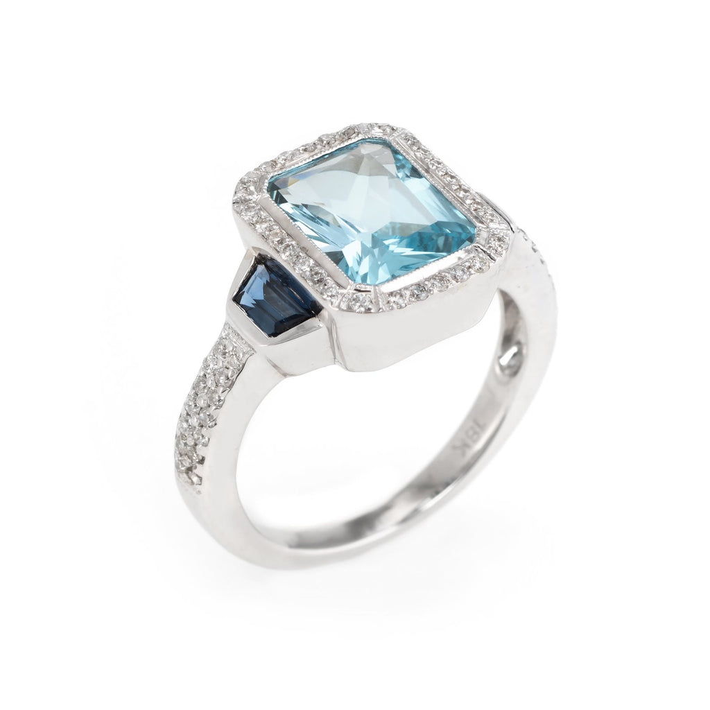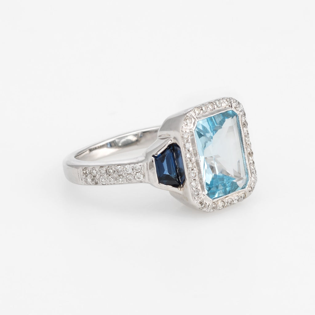 Finely detailed estate blue topaz, sapphire & diamond ring, crafted in 18 karat white gold.
