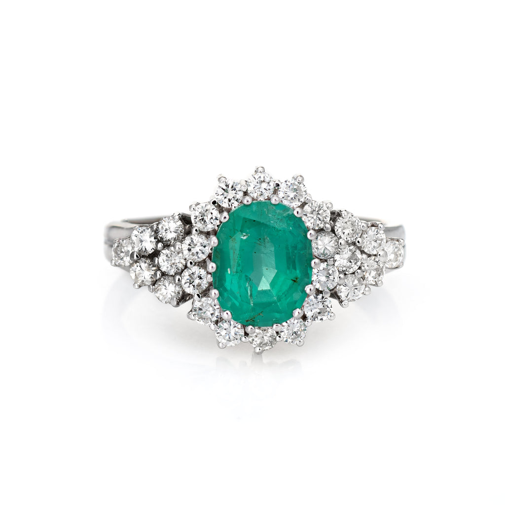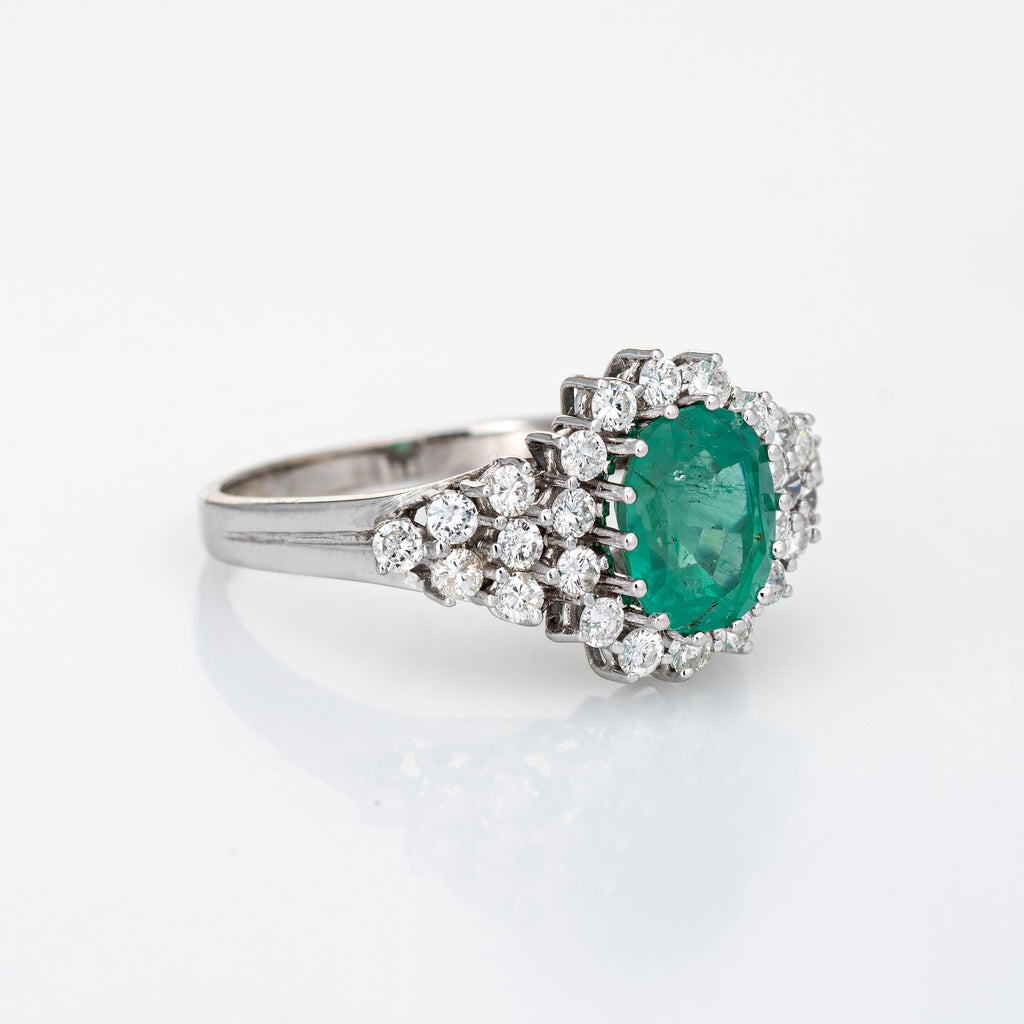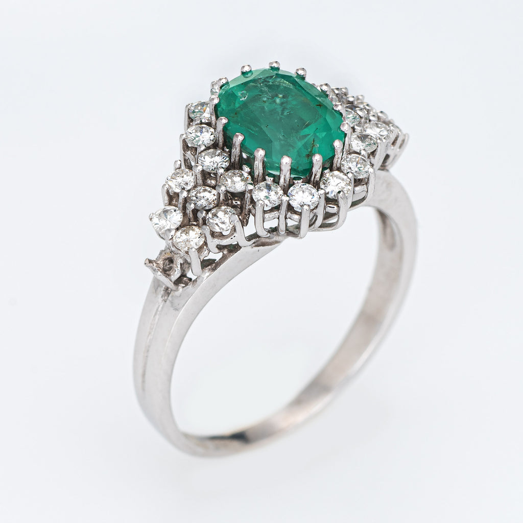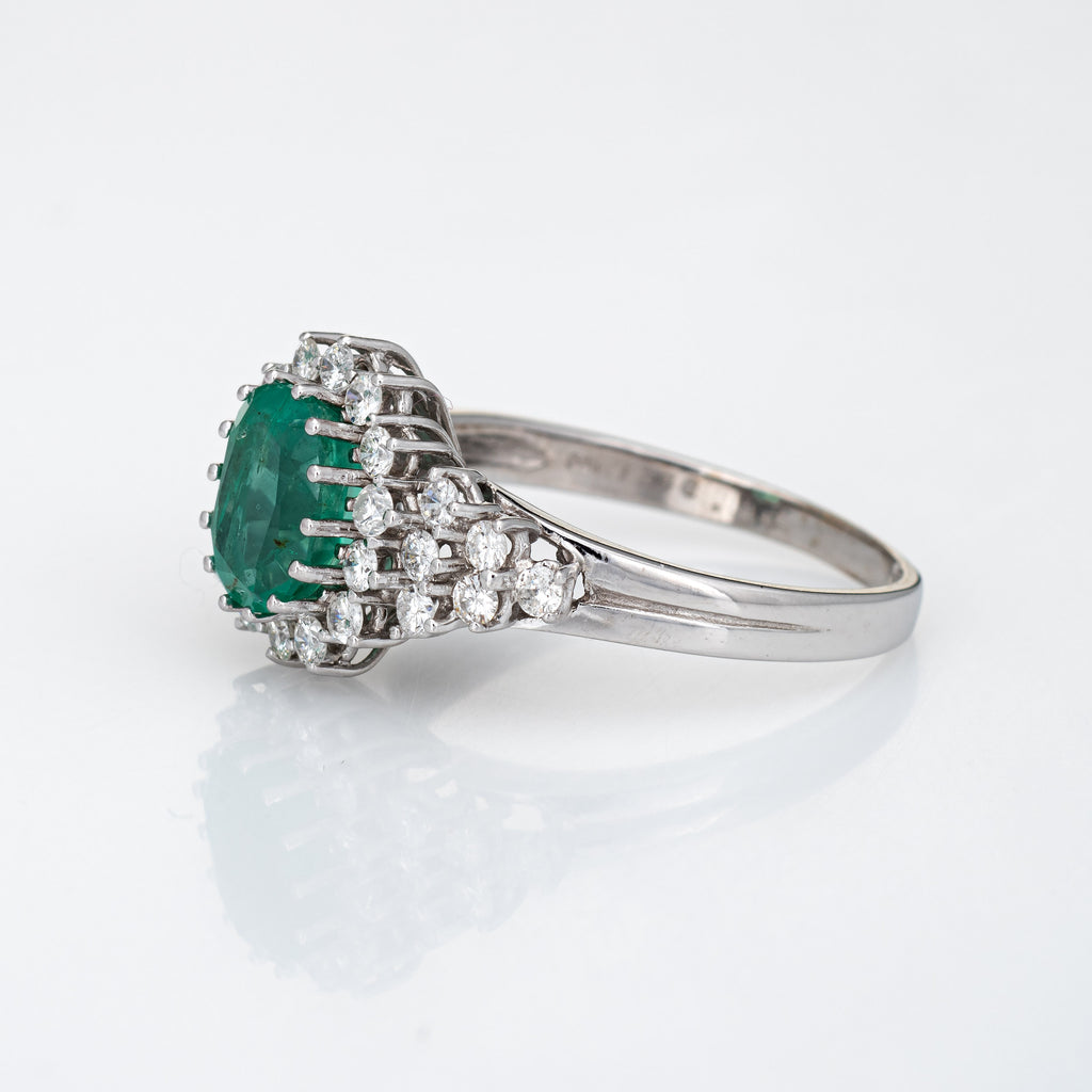 Stones: 28 round brilliant cut diamonds total an estimated 0.78 carats (estimated at G-H color and VS2 clarity). The emerald measures 8.5mm x 6.5mm (estimated at 2 carats). The emerald is in very good condition (few light surface abrasions from wear).