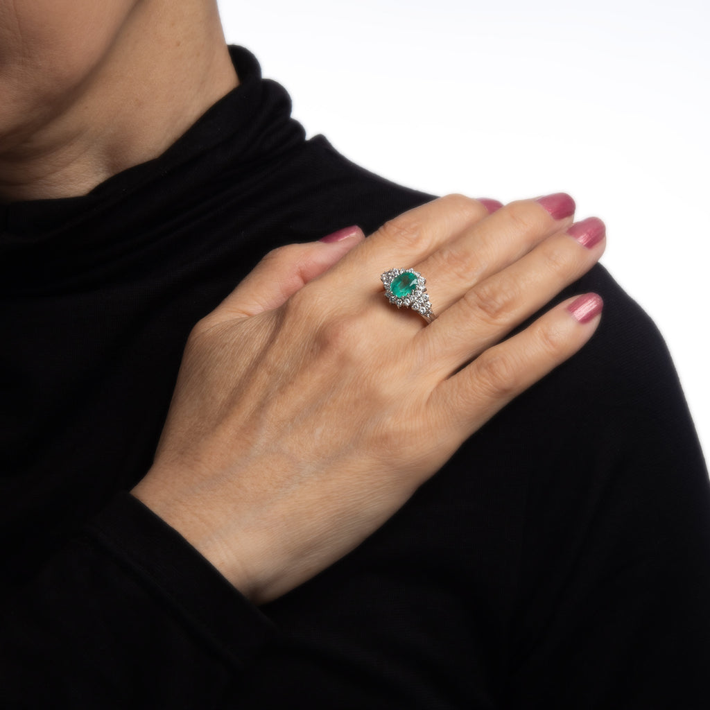 The vibrant green emerald is accented with round brilliant cut diamonds in an oval design. The diamonds shimmer with every movement of the ring & the ring makes a great statement on the hand. Ideal for wear as a gemstone engagement ring or right hand ring for everyday wear. The medium rise ring (8mm - 0.31 inches) sits comfortably on the finger.