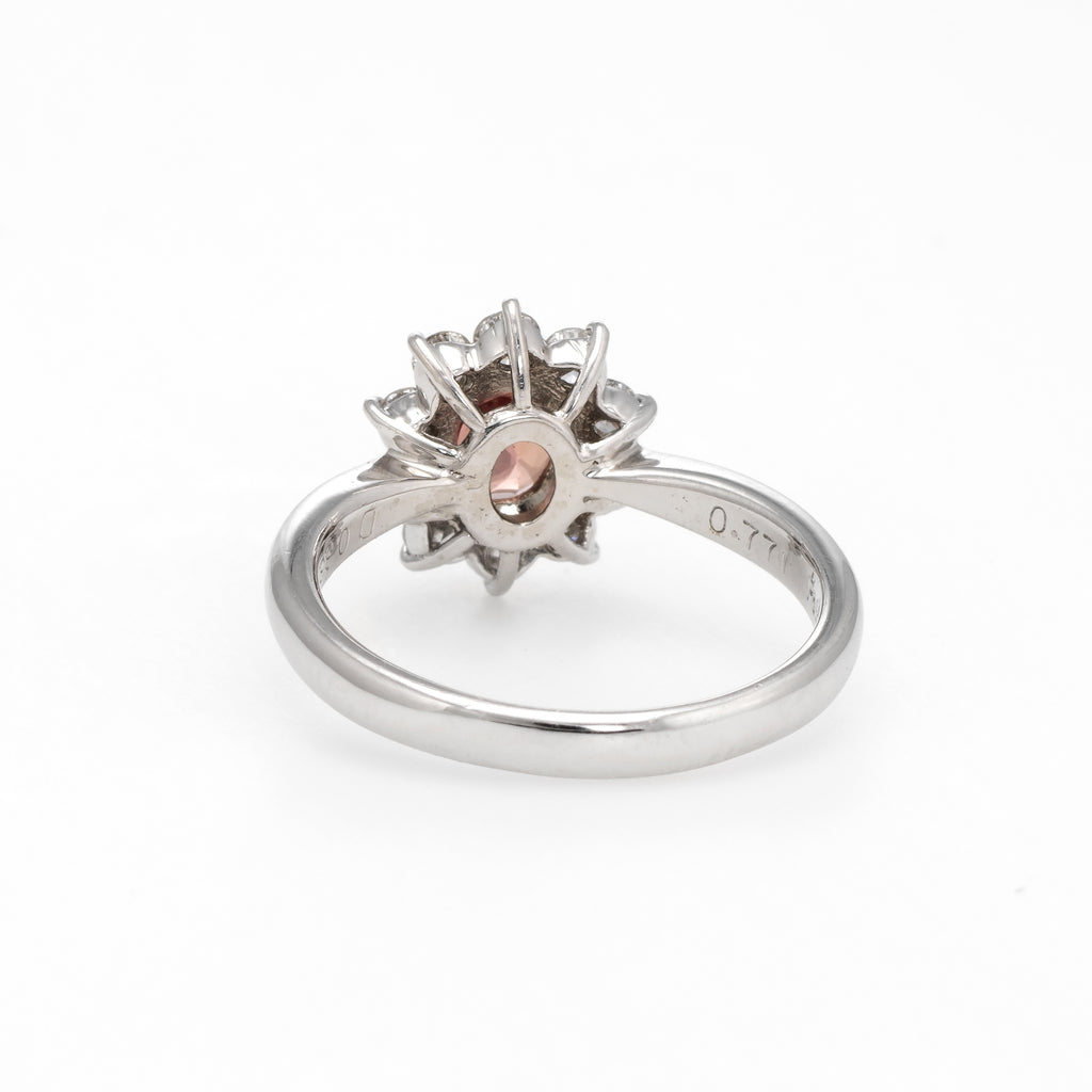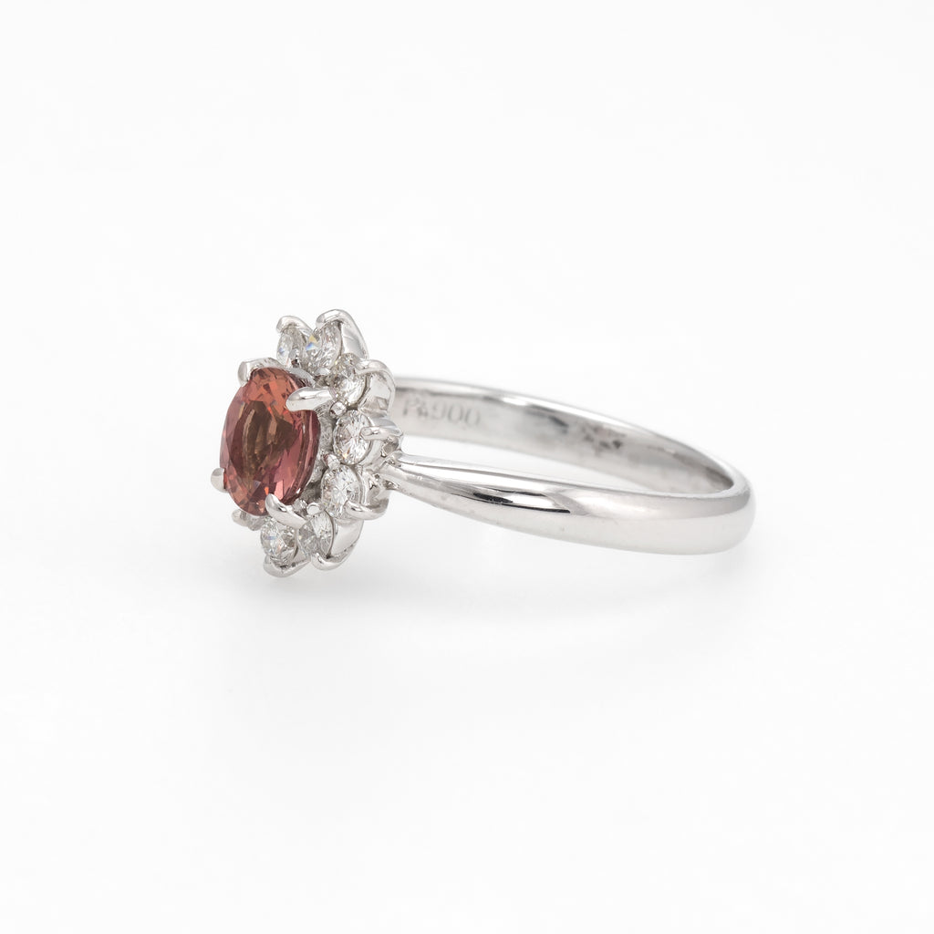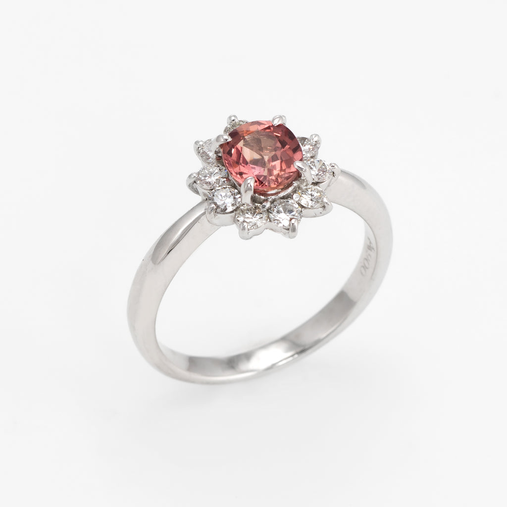 Elegant & finely detailed natural Padparadscha pink sapphire & diamond ring, crafted in 900 platinum.