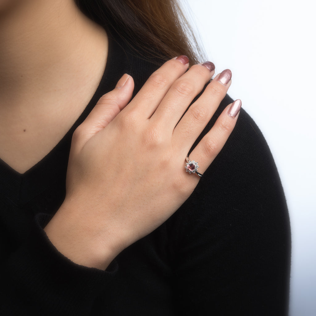 The ring epitomizes vintage charm and would make a lovely alternative engagement ring. The sapphire is a warm musky pink color in the classic princess mount (a similar engagement ring is worn by Princess Eugenie). Also great worn as a right hand or cocktail ring.