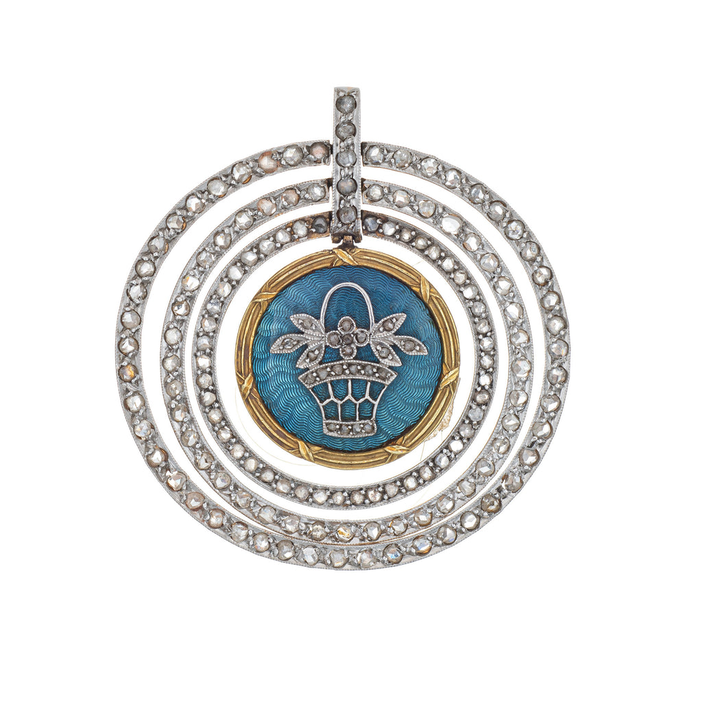 The beautifully detailed pendant features a center set basket of flowers set upon a blue guilloche enamel base. The back of the piece features a locket that opens to accommodate a picture or keepsake. Old rose cut diamonds are set into three separate circular panels, hinged to allow for movement. The fineness and delicate milgrain detail reflect jewelry of the Edwardian era when lockets were a way to memorialize a loved one. The bale measures 2mm wide and is designed for a fine link chain.