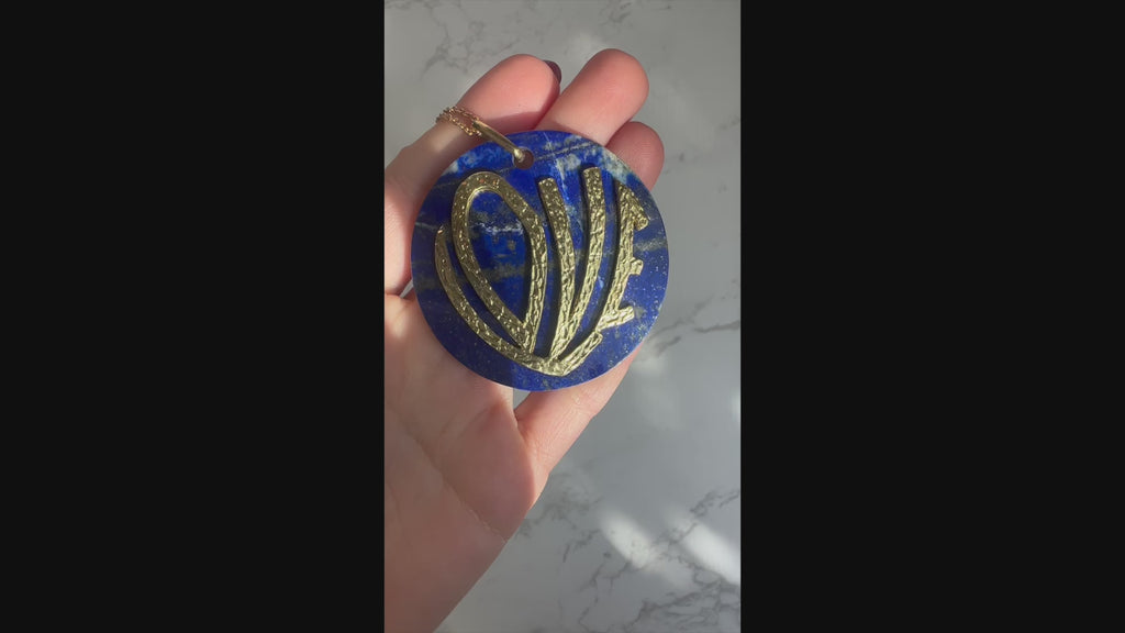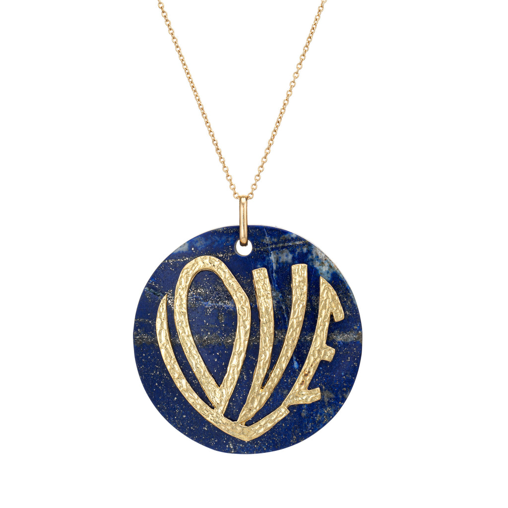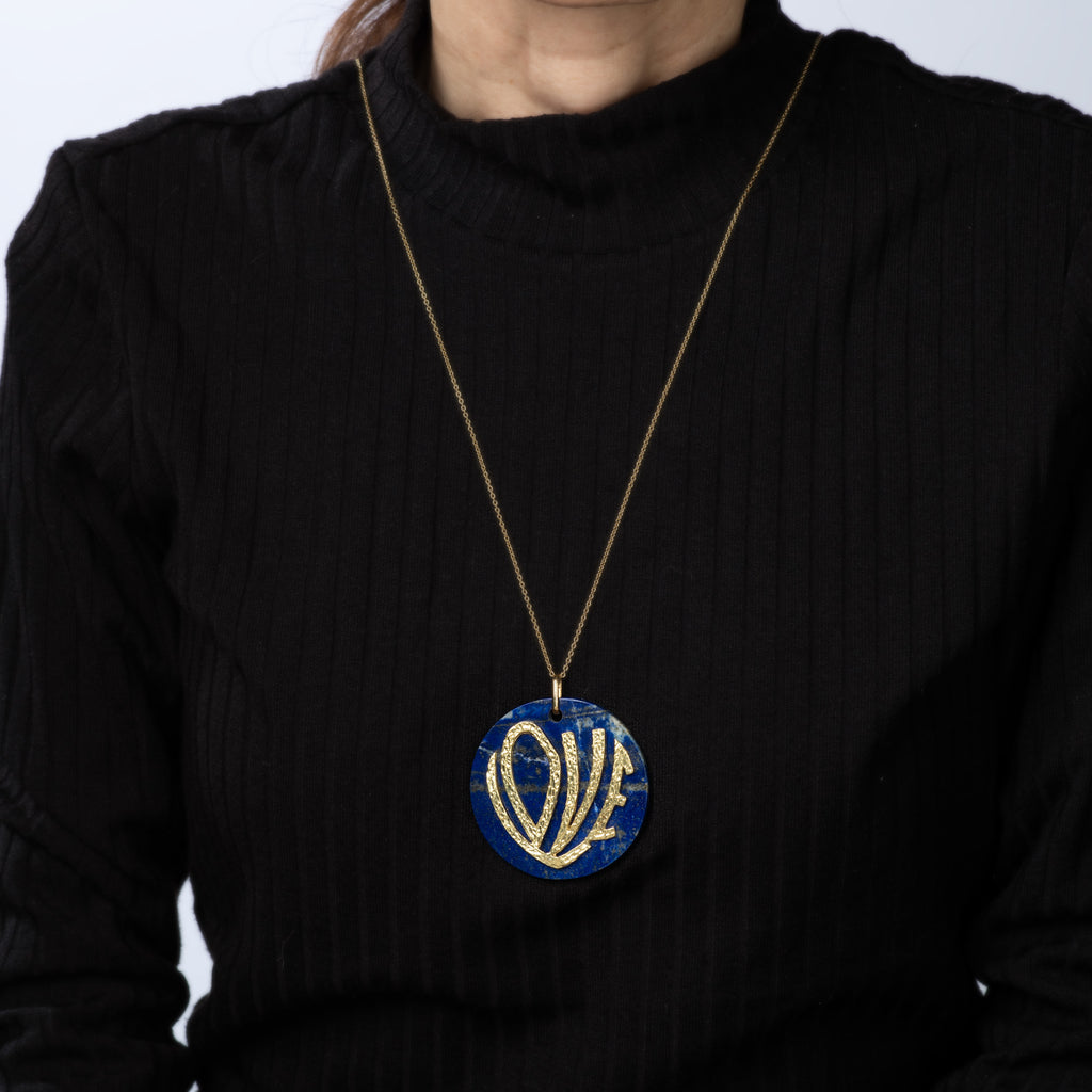 Bold, playful and instantly recognizable, the LOVE necklace in sweeping pop art typography captures the joyful spirit of an unforgettable decade - the 1970s. Set upon rich cobalt blue lapis lazuli, the simplicity of the word 'love' never goes out of style, and the pendant is a great example of the fearless design spirit of the 1970s. The pendant is suspended from a long 30.5 inch chain, with the necklace wearing effortlessly long, allowing the pendant to sit perfectly at mid-torso - exactly where statement pieces were styled during the decade of bold self-expression.