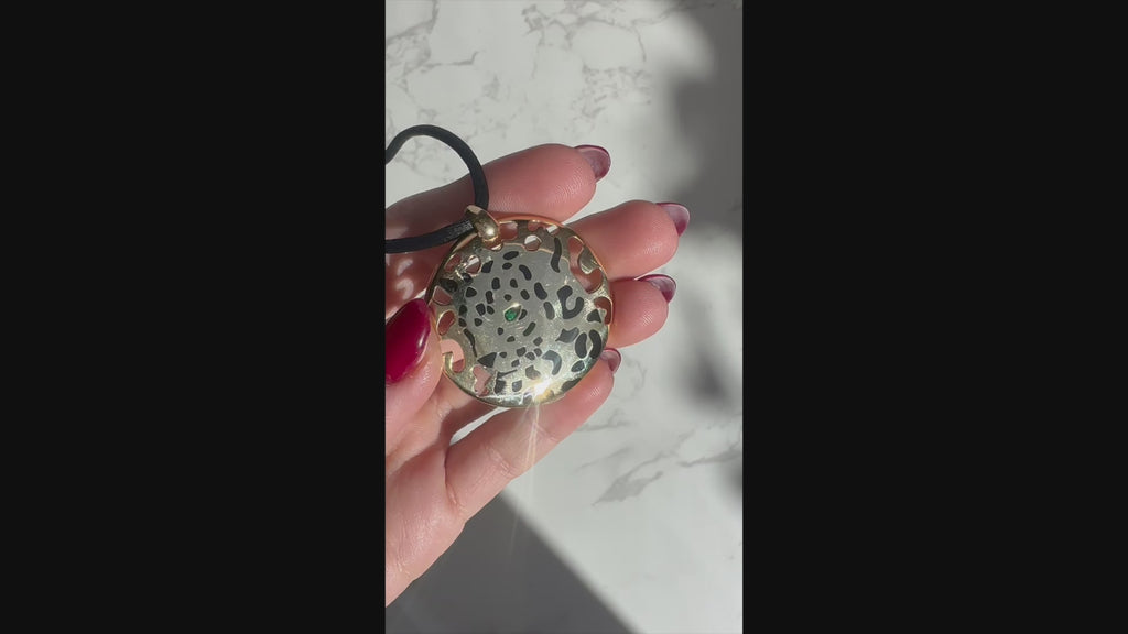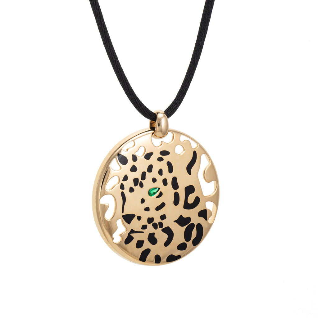 Crafted in 18k yellow gold the focal point is the Cartier panthere motif, a sculptural representation of the animal that has become one of the Maison's most iconic signatures. With black enamel and a tsavorite green garnet eye, the pendant comes with a black silk cord chain with 18k yellow gold end terminals. Great worn alone as a statement piece or layered. The pendant and necklace is an out of production Cartier piece. No Cartier box or papers.