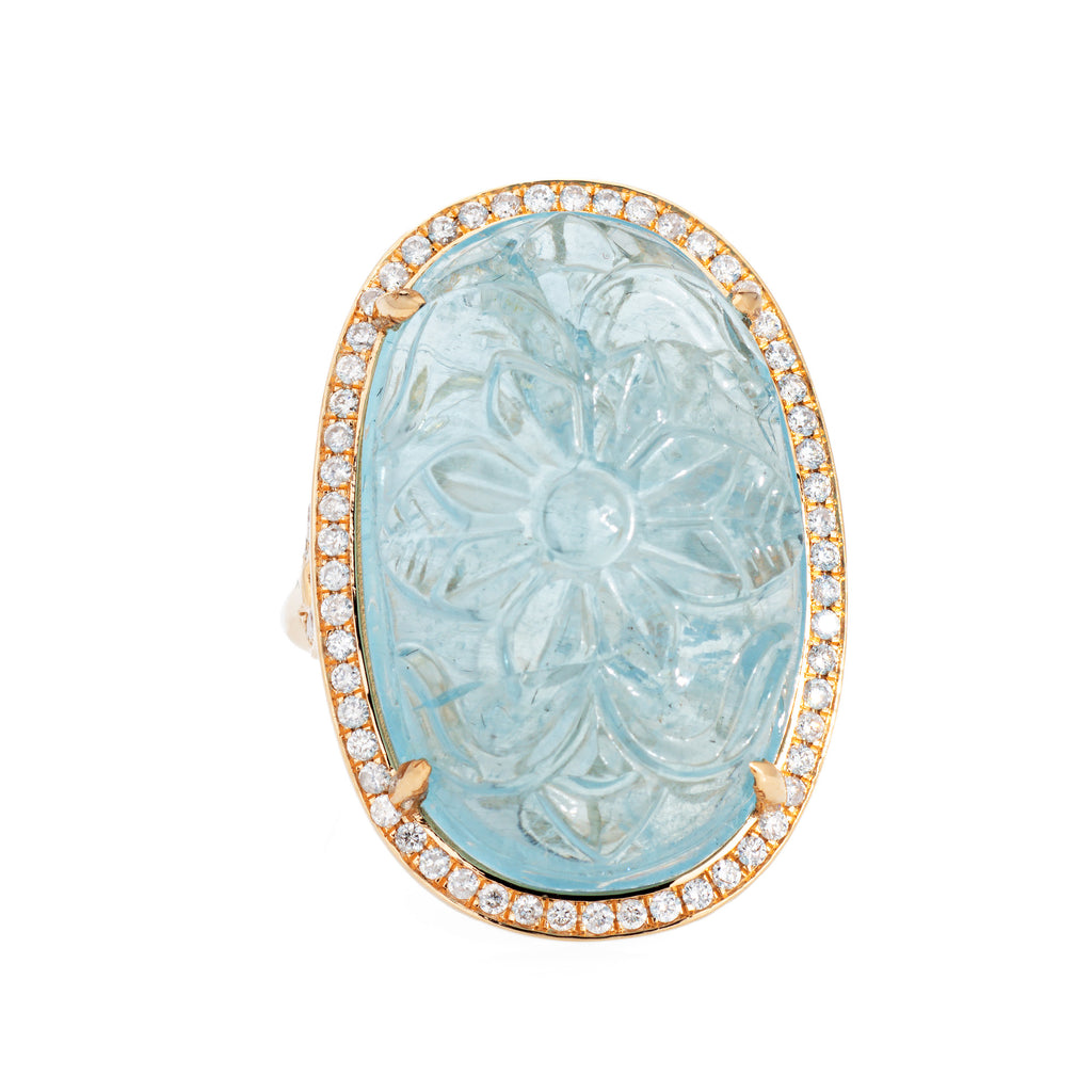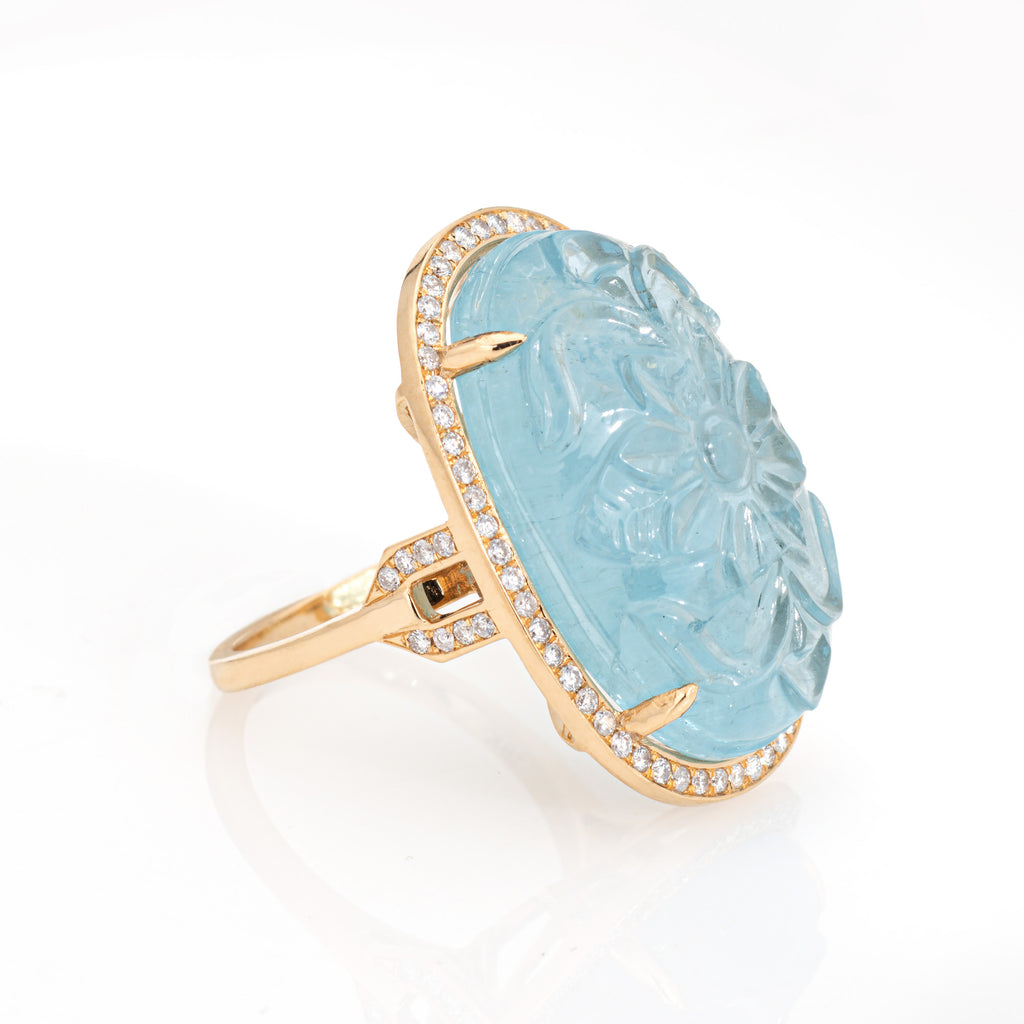 The light to medium blue aquamarine is beautifully carved in the form of a flower, accented with a halo of sparkling diamonds. Large in scale the statement ring adds a nice pop of color on the hand. The medium rise ring (12mm - 0.47 inches) sits comfortably on the finger.