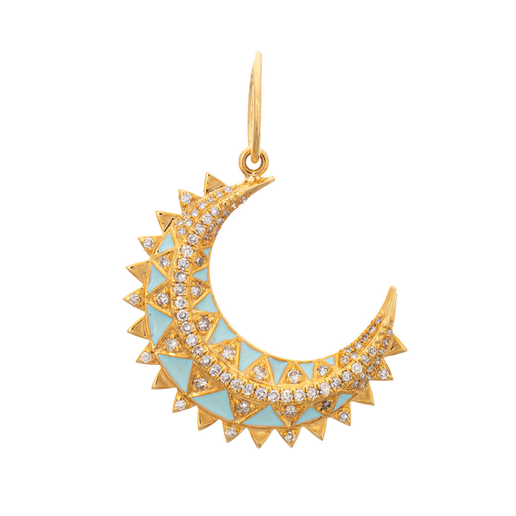 Diamond Crescent Moon Pendant 14k Yellow Gold Egg Shell Blue Enamel Sunburst