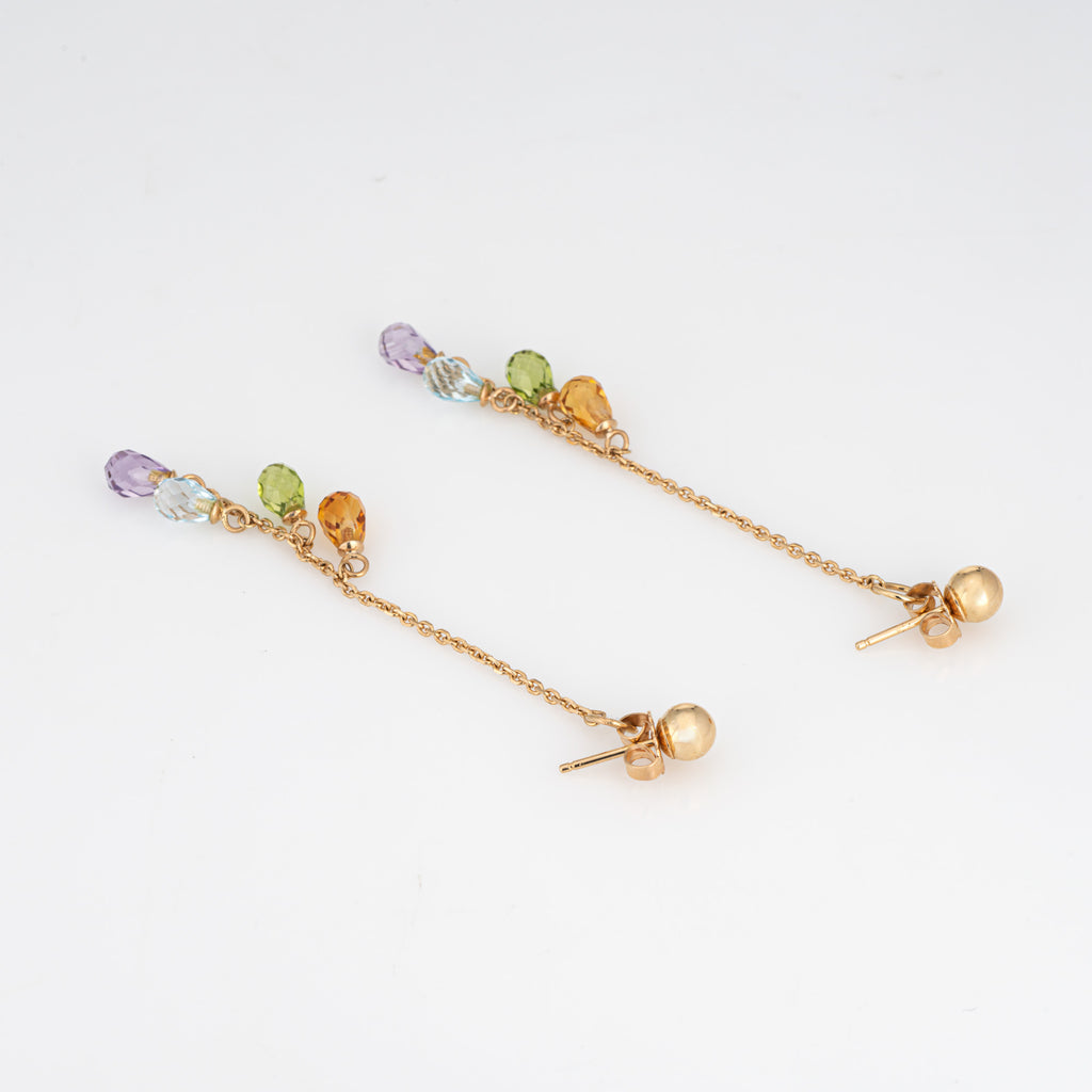 Fine detailed pair of semi precious rainbow gemstone drops crafted in 14k yellow gold.