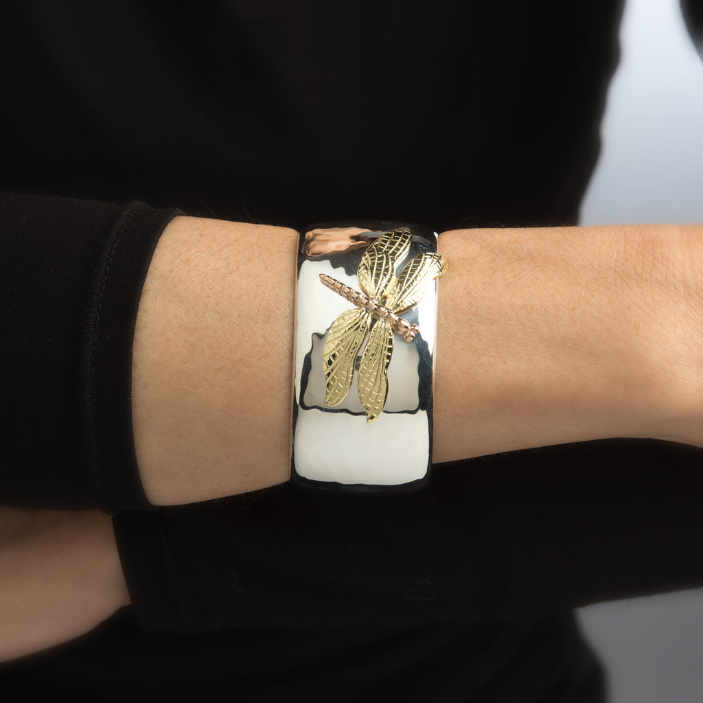 Finely detailed Tiffany & Co dragonfly cuff bracelet, crafted in sterling silver and 18 karat yellow and rose gold
