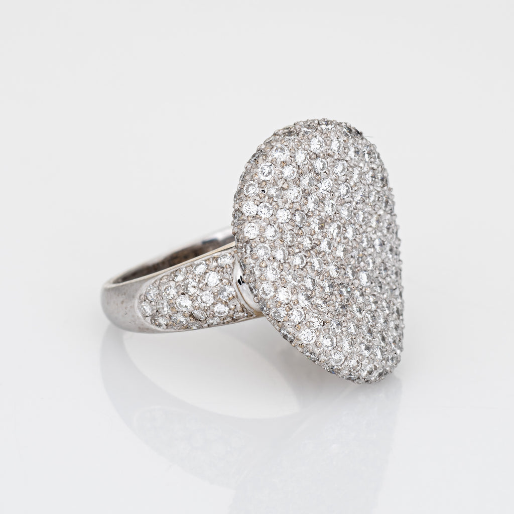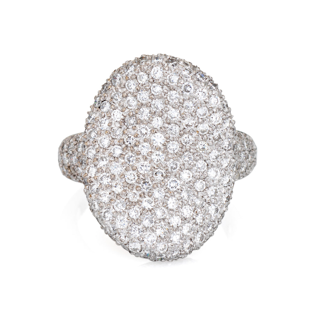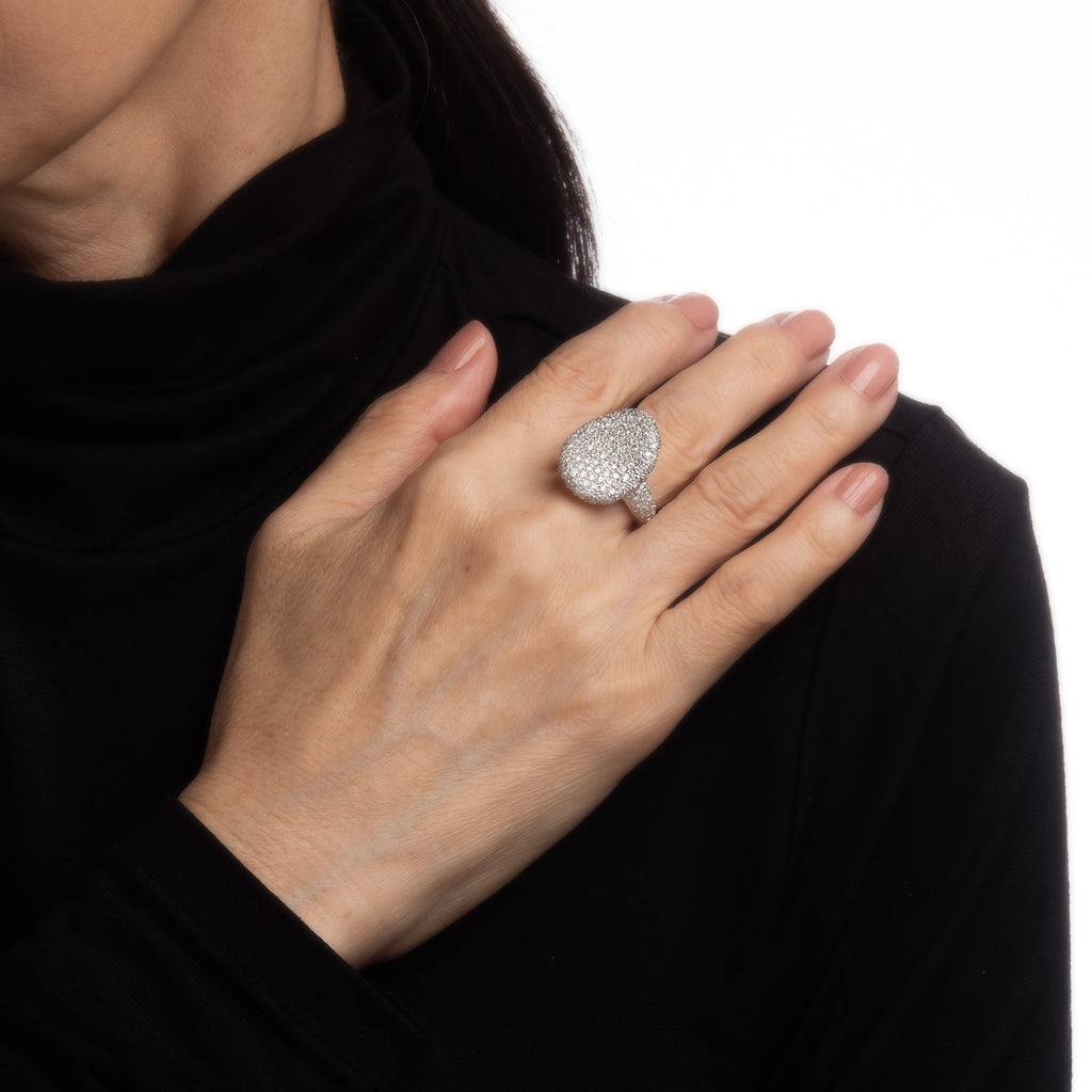 The oval cocktail ring features a unique undulating design that allows the diamonds to capture light and shimmer. The cocktail ring is medium to larger in scale and makes a great statement on the hand. The medium rise ring (8mm - 0.31 inches) sits comfortably on the hand.